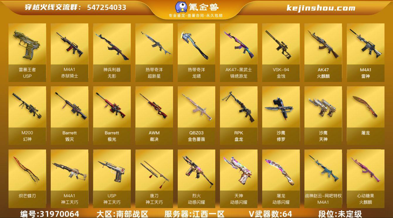 江西一区-66V-6王者武器数-0炫金武器数 【热门武器】:QBZ03-金色蔷薇,M200-幻神,炼狱-迷你小钢,毒蜂,RPK-盘龙*5,沙鹰-修罗*4,炽芒蝶刃 【王者炫金武器】:USP-雷暴王者,王者之魄高爆手雷,王者之魄闪光弹 【音效卡】:烈火-动感闪耀 音效卡,AK47-火麒麟音效卡,M4A1-雷神音效卡,Barrett-毁灭音效卡,Barrett-极光音效卡 【皮肤】:M200-幻神-黄忠皮肤,金色蔷薇-热带奇洋 皮肤,M4A1-战神赵云,雷神-宇航兔皮肤,火麒麟-平天大圣,火麒麟-心动糖果 【角色】:晴雅,奇洋探员,乔伊教练,初恋灵狐,飞虎队-X,风暴女,嘉年华灵狐,猎狐者-追月,灵狐者-黄金海岸,斯沃特-X,兔囡囡,雪莉杨,樱-战斗天使,游珑儿 【人偶武器】:炼狱-迷你小钢,AWM-灵狐-15周年嘉年华*2,迷你牛牛,迷你生化手雷*3,生化手雷-机甲核心,深渊终结者手雷,灵狐娃娃手雷 【暴走生化】:毒蜂,双面神,超级对讲机 【挑战大师】:激光毁灭者III-白马银枪,神圣爆裂者-末日III 【英雄级武器】:AK47-火麒麟,M4A1-雷神,M4A1-神工天巧,无影-神兵利器,黑武士-锦绣游龙,超新星-热带奇洋,QBZ03-金色蔷薇,烈火-动感闪耀,王者之势-觉醒版,白虎之魄-觉醒版,Barrett-毁灭,Barrett-极光,AWM-裁决,M200-幻神,VSK-94-金蚀,RPK-盘龙*5,沙鹰-修罗*4,沙鹰-天神,USP-神工天巧*2,天神-动感闪耀,屠龙*2,炽芒蝶刃,唐刀-神工天巧*4,屠龙-动感闪耀,龙啸-热带奇洋,高爆手雷-神工天巧*7,手雷-动感闪耀,高爆手雷-云龙,手雷-热带奇洋,闪光弹-神工天巧*7,闪光弹-云龙,烟雾弹-神工天巧*7,烟雾弹-云龙,M4A1-赤狱骑士 【道具】:云山科技背包,冰冰企鹅背包,奇洋探员-海龟背包,热带奇洋炫彩背包,超级背包,女皇终结者-魔龙之吻,绿色巨人,灵魂忍者*2,变异宝贝,迷雾幽灵*2,生化弹匣,夺命之镰*2,防化服*3,金色流光-...