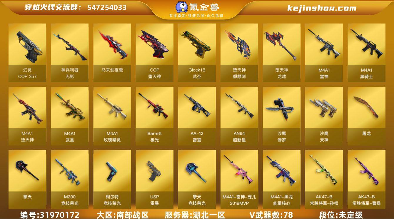 湖北一区-84V-5王者武器数-0炫金武器数 【热门武器】:M200-竞技荣光,M4A1-黑骑士*5,USP-雷暴,COP-堕天神*3,COP 357-幻灵,沙鹰-修罗*2 【王者炫金武器】:王者玉锋 【音效卡】:Barrett-极光音效卡 【皮肤】:雷神-宠儿-2019MVP,雷神-源计划2.0专属 皮肤,毁灭-魔灵皮肤,毁灭-秦师 皮肤,黑龙-能量核心,AK47-B-常胜将军-曹操*2,AK47-B-常胜将军-刘备*2,AK47-B-常胜将军-孙权,极光-能量核心*2,修罗-能量核心,屠龙-荣耀世冠AG 【角色】:迷迭香,电竞教官-云悠悠,奇洋探员,暗夜-X,初恋灵狐,芳心审判者,风暴女,嘉年华灵狐,灵狐者-X,灵狐者-职业经理,龙儿-小淘气,潘多拉-X,潘多拉-甜心教官,斯沃特-X,铁骑荣耀 【人偶武器】:巴雷特-零-水下丽影,AWM-灵狐-15周年嘉年华,深渊终结者手雷,闪光弹-貂蝉,高爆手雷-大乔,Barrett-夜玫瑰,QBZ03-斯沃特,灵狐娃娃手雷 【挑战大师】:暴君乱世-超越Max,神圣爆裂者III,冰龙粉碎者-白马银枪*2,激光毁灭者III-白马银枪,VEPR-12-金魔,激光毁灭者III,机甲撕裂者III,神圣爆裂者-末日III,阐释者III 【英雄级武器】:M4A1-雷神,M4A1-黑骑士*5,AN94-超新星,M4A1-武圣,M4A1-堕天神,无影-神兵利器,M4A1-玫瑰精灵,QBZ-03-王者蔷薇-觉醒版,Barrett-极光,M200-竞技荣光,王者之光-觉醒版,王者风神-觉醒版,AA-12-雷霆,沙鹰-修罗*2,沙鹰-天神,USP-雷暴,COP-堕天神*3,COP 357-幻灵,柯尔特-竞技荣光,Glock18-武圣,屠龙*2,麒麟刺-堕天神,马来剑-夜魔,擎天*3,擎天-竞技荣光*2,龙啸-堕天神,高爆手雷-堕天神*7,高爆手雷-夜魔,高爆手雷-幻灵,高爆手雷-竞技荣光*6,闪光弹-堕天神*7,闪光弹-夜魔,闪光弹-竞技荣光*5,闪光弹-雷霆王者-觉醒版,烟雾弹-堕天神*7,烟雾弹-夜魔,烟雾弹-竞技荣光*6 【道