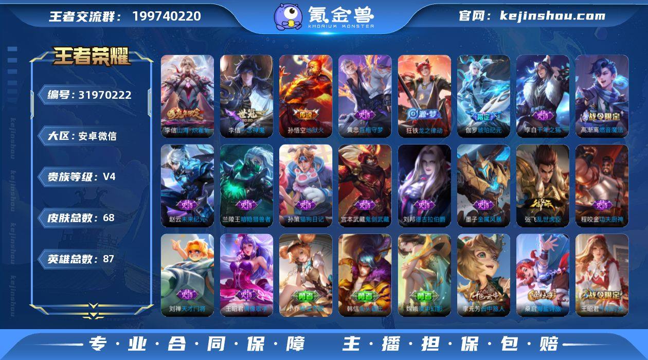 炽霜斩·一念神魔·地狱火·街头霸王·可二次】w16102-安卓WX-87英雄-68皮肤-3王者印记-50铭文-贵族积分2w【贵族4】【·3传说·2按键】【因赛季更新游戏段付以上号为准!】 【传说皮肤】:李信山海炽霜斩,李信一念神魔,孙悟空地狱火 【限定皮肤】:狄仁杰阴阳师,孙尚香蔷薇恋人,元歌无心,项羽海滩派对,王昭君午后时光,兰陵王金庭之子,李元芳云中旅人,沈梦溪大漠名商,狂铁电玩高手,李信山海炽霜斩,鲁班大师探海日志,桑启海盐诗旅,张良古海寻踪,高渐离燃音魔法,妲己灵卜魔法,鬼谷子天穹祈灯,伽罗琥珀纪元 【年限皮肤】:李信山海炽霜斩 【赛季限定】:兰陵王金庭之子,沈梦溪大漠名商,李元芳云中旅人,桑启海盐诗旅,鲁班大师探海日志,张良古海寻踪,鬼谷子天穹祈灯,甄姬逆浪荇歌 【战令限定】:狂铁电玩高手,王昭君午后时光,高渐离燃音魔法,妲己灵卜魔法,周瑜线条小狗 【史诗皮肤】:赵云未来纪元,王昭君偶像歌手,宫本武藏鬼剑武藏,孙尚香蔷薇恋人,墨子金属风暴,李白千年之狐,张飞乱世虎臣,刘邦德古拉伯爵,兰陵王暗隐猎兽者,刘禅天才门将,程咬金功夫厨神,阿轲节奏热浪,孙策猫狗日记,狂铁电玩高手,元歌无心,妲己灵卜魔法,高渐离燃音魔法,伽罗琥珀纪元,狂铁龙之律动,黄忠百相守梦,周瑜线条小狗 【其他皮肤】:项羽海滩派对,韩信教廷特使,韩信街头霸王,赵云忍炎影,安琪拉玩偶对对碰,张飞五福同心,狄仁杰阴阳师,钟无艳海滩丽影,王昭君幻想奇妙夜,老夫子功夫老勺,典韦铁甲之心,程咬金无双福将,兰陵王金庭之子,刘禅唤灵魔甲,米莱狄契约魔法,王昭君午后时光,沈梦溪大漠名商,蒙恬蔚蓝守将,李元芳云中旅人,桑启海盐诗旅,鲁班大师探海日志,张良古海寻踪,钟无艳聚星闪耀,海月王牌新星,亚连破局者,鬼谷子天穹祈灯,妲己灵卜魔法,嫦娥漠中幻影,甄姬逆浪荇歌,...