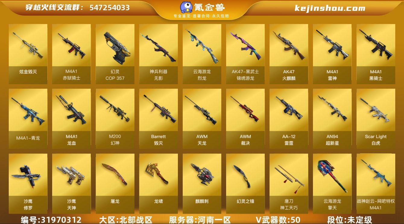 河南一区-52V-0王者武器数-1炫金武器数 【热门武器】:Scar Light-白虎,M4A1-青龙,M200-幻神,M4A1-黑骑士,COP 357-幻灵*2,沙鹰-修罗 【王者炫金武器】:炫金毁灭 【音效卡】:Scar Light-白虎音效卡,Barrett-碧霄极光音效卡,炼狱-百战金芒-庆典舞曲音效卡 【皮肤】:幻神-动感闪耀 皮肤,白虎-百战金芒 皮肤,裁决-运输船 皮肤,雷神-暗月,M4A1-战神赵云,雷神-R.LGD-CFPLS18冠军,M4A1-再燃火线,火麒麟-雷神,火麒麟-心动糖果,毁灭-暗月,毁灭-英雄计划 皮肤,黑骑士-暗月,屠龙-惊鸿 皮肤,轻型军用手斧-再燃火线 【角色】:战地猎狐,王者潘多拉,蛇隐宗,奇洋探员,乔伊教练,云海玲珑,暗夜-X,北极狐-X,初恋灵狐,风暴女,虎妞,嘉年华灵狐,疾风,灵狐者-X,龙儿,潘多拉-X,青霞仙子,蛇姬,斯沃特-X,新娜塔莎 【人偶武器】:迷你深渊冰龙,迷你波特博士,夺魂,生化手雷-机甲核心,深渊终结者手雷,AK12-夜玫瑰 【暴走生化】:超级对讲机 【挑战大师】:冰龙粉碎者-白马银枪,激光毁灭者III-白马银枪,激光毁灭者III 【英雄级武器】:AK47-火麒麟*2,M4A1-雷神*3,M4A1-黑骑士,AN94-超新星,M4A1-龙血,M4A1-青龙,Scar Light-白虎,无影-神兵利器,黑武士-锦绣游龙,AWM-天龙,Barrett-毁灭,AWM-裁决,M200-幻神,炼狱-百战金芒,烈龙-云海游龙,AA-12-雷霆,沙鹰-修罗,沙鹰-天神,COP 357-幻灵*2,屠龙,龙啸,麒麟刺,幻灵之锋*2,唐刀-神工天巧,擎天-云海游龙,麒麟刺-百战金芒,丛林匕首-玄豹,高爆手雷-幻灵,手雷-云海游龙,高爆手雷-古蛇迷踪,高爆手雷-玄豹,闪光弹-幻灵,闪光弹-神工天巧,闪光弹-玄豹*2,烟雾弹-幻灵*2,烟雾弹-玄豹,M4A1-赤狱骑士,M4A1-苍鸣雷神,Barrett-碧霄极光 【道具】:BS战队炫彩背包,CFS限定背包,云海游龙炫彩背包,亚洲杯纪念炫彩背包,全能枪...