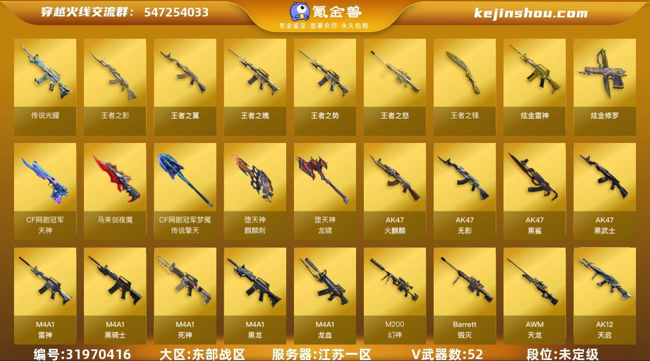 江苏一区-56V-7王者武器数-2炫金武器数 【传说武器】:传说光耀 【热门武器】:传说光耀,M200-幻神,C.A.T,M4A1-黑骑士,汤姆逊-烈龙*2,加特林-炼狱*2,火麒麟-绝迹,沙鹰-修罗*4 【王者炫金武器】:王者之翼,王者之势,王者之影,王者之魄,王者之怒,王者之锋,炫金雷神,炫金修罗 【音效卡】:Barrett-毁灭音效卡 【皮肤】:烈龙-星空,雷神-暗月,雷神-荣耀之魄,火麒麟-华夏之心,火麒麟-心动糖果,毁灭-星空,黑龙-能量核心,战神-粉色甜心皮肤,战神-紫绶金章皮肤*5,战神-流金岁月皮肤*3,AWM-天龙-传奇70KG,修罗耀金皮肤 【角色】:葵,王者-葵-貂蝉,云海玲珑,娟娟,潜龙队-X,斯沃特-X,蜀雪,铁骑荣耀,影武者-X,雅典娜 【人偶武器】:火麒麟-绝迹,C.A.T,闪光弹-小乔 【暴走生化】:超级对讲机 【英雄级武器】:AK47-火麒麟*2,M4A1-黑龙,M4A1-雷神,M4A1-黑骑士,AK47-无影,M4A1-死神,AK47-黑武士,AK12-天启,AK47-黑鲨*3,M4A1-龙血,AK-47-猩红传说,AK47-B-战神,黑武士-CF网剧冠军,AWM-天龙,Barrett-毁灭,M200-幻神,王者幻神-觉醒版,加特林-炼狱*2,汤姆逊-烈龙*2,沙鹰-修罗*4,天神-CF网剧冠军,屠龙,龙啸,麒麟刺-堕天神,马来剑-夜魔,擎天,麒麟刺,龙啸-堕天神,擎天-CF网剧冠军,高爆手雷-雷霆,高爆手雷-堕天神,高爆手雷-夜魔,闪光弹-雷霆,闪光弹-堕天神,闪光弹-夜魔,烟雾弹-雷霆,烟雾弹-堕天神,烟雾弹-夜魔 【道具】:战舰背包,炫彩背包,超级背包,变异宝贝,夺命之镰,防化服,C4-沙漠,防弹头盔*3,防弹衣*3,C4工具钳*3,手雷包*3 【特殊枪械】:1黑骑士,2烈龙,2炼狱