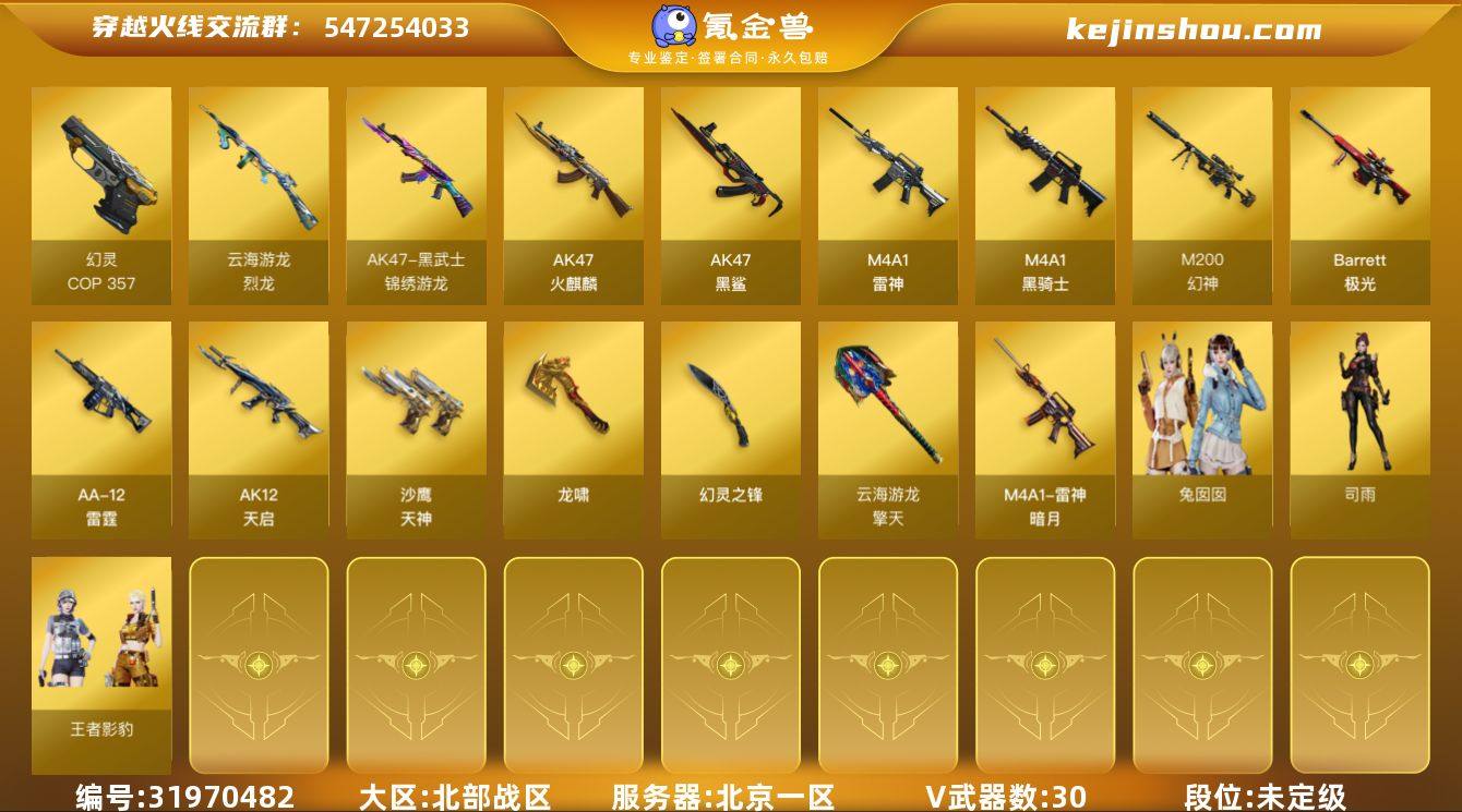 北京一区-36V-3王者武器数-0炫金武器数 【热门武器】:M200-幻神,凤吟之魄,QBZ03-街机,牛牛-AK47,M4A1-黑骑士,COP 357-幻灵 【王者炫金武器】:凤吟之魄,王者玉锋 【音效卡】:Barrett-极光音效卡 【皮肤】:幻神-冠军之幻,幻神-AG-CFPL S24冠军 皮肤,幻神-电竞之星 皮肤,雷神-暗月,雷神-源计划2.0专属 皮肤,龙啸-巅峰荣耀 皮肤 【角色】:司雨,王者影豹,蛇隐宗,乔伊教练,云海玲珑,电竞少女,猎狐者-追月,灵狐者-X,灵狐者-七夕宝贝,流浪蔷薇,龙儿-小淘气,曼陀罗-X,潘多拉-甜心教官,蛇姬,兔囡囡,新娜塔莎,影武者-X 【人偶武器】:Scar Light-马枪,牛牛-AK47,迷你牛牛,迷你生化手雷,深渊终结者手雷,AK12-烈火-灵狐者,灵狐娃娃手雷 【暴走生化】:双面神 【挑战大师】:冰龙粉碎者-白马银枪*2,机甲撕裂者III,KAC-圣炎切割者III 【英雄级武器】:AK47-火麒麟,M4A1-雷神,M4A1-黑骑士,AK12-天启,AK47-黑鲨,黑武士-锦绣游龙,王者风势-觉醒版,Barrett-极光,M200-幻神,烈龙-云海游龙,AA-12-雷霆,沙鹰-天神,COP 357-幻灵,龙啸*2,幻灵之锋,擎天-云海游龙,高爆手雷-幻灵,高爆手雷-竞技荣光*2,手雷-云海游龙,高爆手雷-古蛇迷踪,闪光弹-幻灵*2,闪光弹-竞技荣光,烟雾弹-幻灵*2,烟雾弹-竞技荣光,烟雾弹-古蛇迷踪 【道具】:云海游龙炫彩背包,冰冰企鹅背包,古蛇迷踪炫彩背包,背包-洛丽塔,绿色巨人,灵魂忍者,迷雾幽灵,夺命之镰*2,防化服*2,金色流光-枪王排位,星辰流光-枪王排位,枪王排位28赛季金色流光,枪王排位29赛季金色流光,古蛇迷踪打击特效,蛇隐宗表情,云海游龙表情,C4-黑曜,防弹头盔*2,防弹衣*2,C4工具钳*2,手雷包*2 【特殊枪械】:1黑骑士