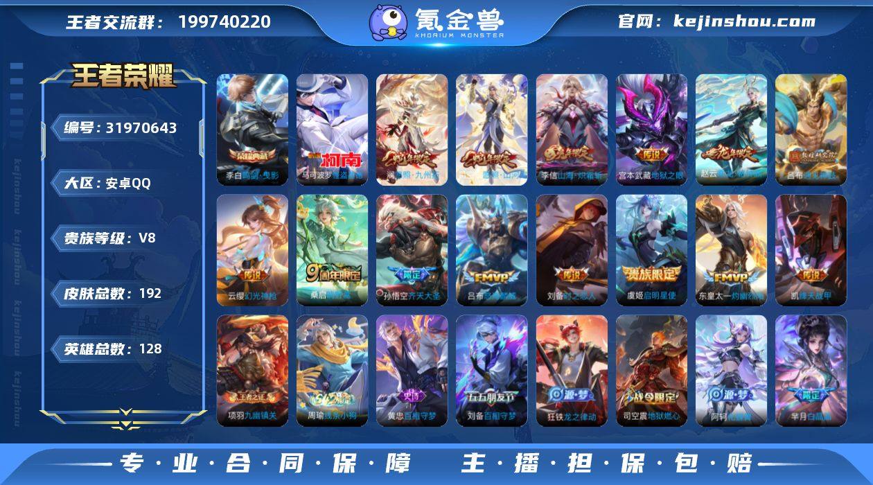 【aswz1495】安卓Q-V8-最强王者段位-128英雄-192皮肤-1典藏皮肤-1珍品传说-14传说-51史诗 【英雄全皮】:孙权全皮,司空震全皮 【荣耀典藏】:李白鸣剑曳影 【珍品传说】:马可波罗怪盗基德 【传说皮肤】:司空震愿照山河定,澜愿照九州拓,云缨幻光神枪,桑启鸣野蒿,赵云乘龙铭钟鼎,吕布遇见神鼓,东皇太一灼幽烈阳,孙悟空齐天大圣,李信山海炽霜斩,吕布怒海麟威,铠绛天战甲,虞姬启明星使,刘备时之恋人,宫本武藏地狱之眼 【限定皮肤】:姜子牙天穹之誓,狄仁杰阴阳师,廉颇寅虎御盾,赵云皇家上将,墨子神迹守卫,孙尚香蔷薇恋人,芈月白晶晶,吕布猎兽之王,吕布遇见神鼓,狄仁杰魔术师,达摩沙漠行僧,项羽海滩派对,孙悟空齐天大圣,刘备百相守梦,李元芳云中旅人,虞姬启明星使,沈梦溪星空之诺,裴擒虎李小龙,裴擒虎擒涛扼浪,云中君纤云弄巧,李信山海炽霜斩,猪八戒猪悟能,西施玲珑珍味,鲁班大师探海日志,桑启海盐诗旅,戈娅驭风魔法,艾琳流音漫舞,司空震地狱燃心,阿古朵江河有灵,张良古海寻踪,高渐离燃音魔法,妲己灵卜魔法,鬼谷子天穹祈灯,伽罗琥珀纪元,赵云乘龙铭钟鼎,百里玄策超元猎域,沈梦溪龙舞盛年,鲁班七号蔬乡物语,李元芳蔬乡物语,刘邦剑破天穹,上官婉儿群星魔术团,程咬金群星魔术团,镜青焰无极,项羽苍威无极,刘备异域游侠,周瑜熔金海岸 【年限皮肤】:廉颇寅虎御盾,李信山海炽霜斩,赵云乘龙铭钟鼎,司空震愿照山河定,澜愿照九州拓 【赛季限定】:达摩沙漠行僧,李元芳云中旅人,桑启海盐诗旅,裴擒虎擒涛扼浪,鲁班大师探海日志,张良古海寻踪,鬼谷子天穹祈灯,刘邦剑破天穹,姜子牙天穹之誓,东皇太一噬灭天穹,钟馗虚灵犬护,甄姬逆浪荇歌,亚瑟荣光之誓,牛魔星界战将,项羽九幽镇关 【战令限定】:吕布猎兽之王,沈梦溪星空之诺,墨子神迹守卫,戈娅驭...