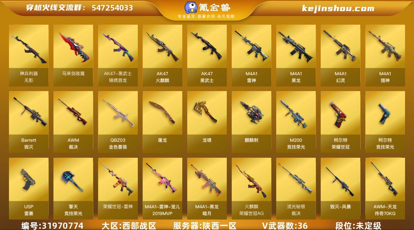 陕西一区-37V-0王者-0炫金 【热门武器】:QBZ03-金色蔷薇,M200-竞技荣光,荣耀世冠-雷神,荣耀世冠-柯尔特,牛牛-AK47,USP-雷暴 【音效卡】:Barrett-毁灭音效卡 【皮肤】:裁决-流光秘银,雷神-宠儿-2019MVP,火麒麟-荣耀世冠AG,毁灭-风暴,黑龙-暗月,AWM-天龙-传奇70KG,屠龙-荣耀世冠AG 【角色】:电竞教官-云悠悠,修道士,暗夜-X,飞虎队-X,嘉年华灵狐,龙儿,龙儿-小淘气,萌儿,蜀雪,樱-战斗天使,游珑儿 【人偶武器】:AWM-灵狐-15周年嘉年华*2,牛牛-AK47,迷你牛牛,灵狐娃娃手雷 【挑战大师】:冰龙粉碎者-白马银枪 【英雄级武器】:AK47-火麒麟,M4A1-黑龙,M4A1-雷神,AK47-黑武士,M4A1-幻灵,无影-神兵利器,黑武士-锦绣游龙,QBZ03-金色蔷薇,M4A1-猎神,荣耀世冠-雷神,Barrett-毁灭,AWM-裁决,M200-竞技荣光,USP-雷暴,荣耀世冠-柯尔特,柯尔特-竞技荣光,屠龙*2,龙啸,马来剑-夜魔,麒麟刺,擎天-竞技荣光,高爆手雷-雷暴,高爆手雷-夜魔,高爆手雷-竞技荣光*4,闪光弹-雷霆,闪光弹-雷暴,闪光弹-夜魔,闪光弹-竞技荣光,烟雾弹-夜魔,烟雾弹-竞技荣光*3 【道具】:Q9战队炫彩背包,亚洲杯纪念炫彩背包,冰冰企鹅背包,超级背包,绿色巨人,灵魂忍者*2,变异宝贝,迷雾幽灵*2,夺命之镰,防化服*2,金色流光-枪王排位,星辰流光-枪王排位,枪王排位28赛季金色流光,枪王排位29赛季金色流光,CFPL选手表情-第1套,EP战队名片,C4-红龙,防弹头盔*3,防弹衣*3,C4工具钳*3,手雷包*3 【特殊枪械】: