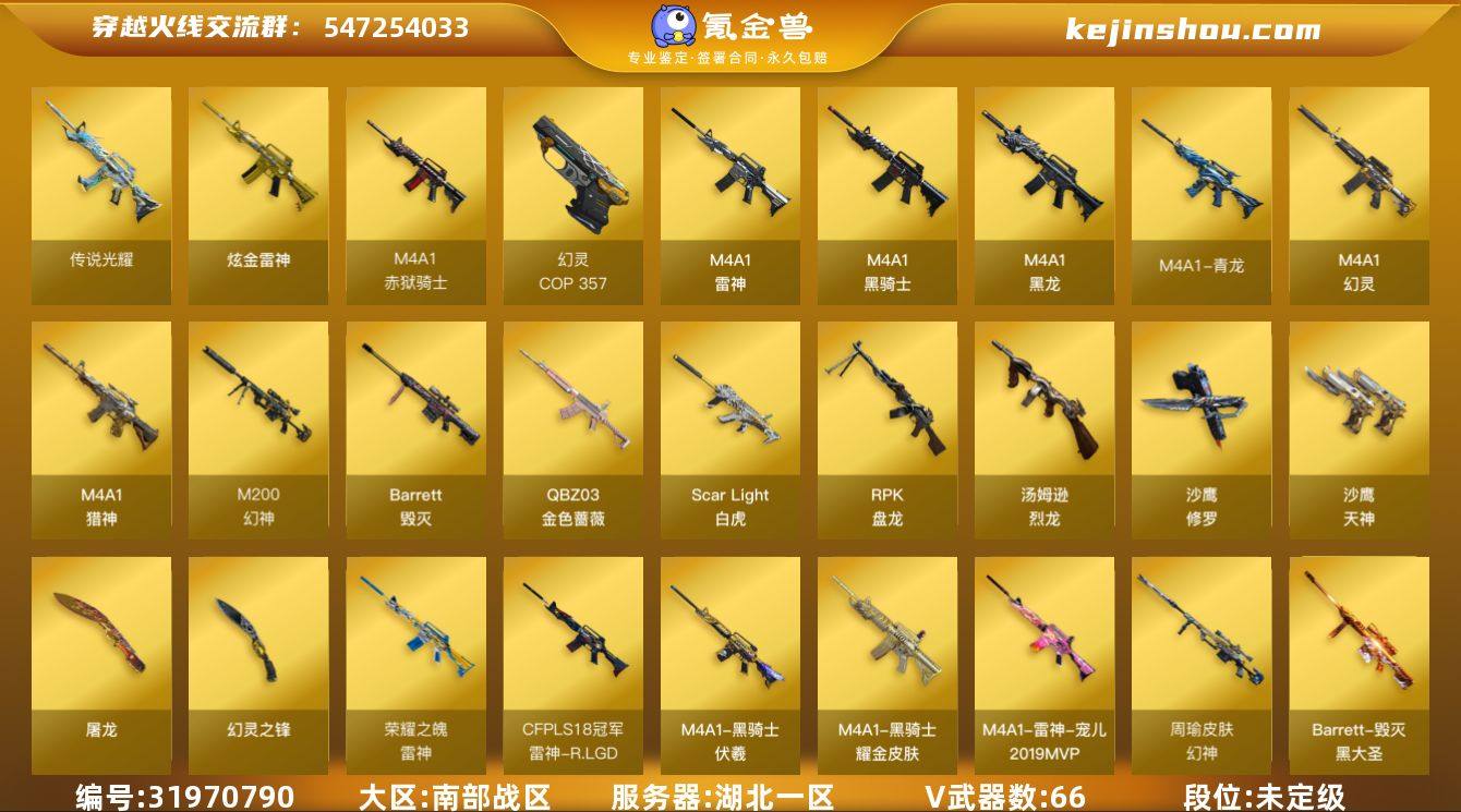 湖北一区-72V-5王者武器数-1炫金武器数 【传说武器】:传说光耀 【热门武器】:传说光耀,QBZ03-金色蔷薇,Scar Light-白虎,M4A1-青龙*2,M200-幻神,死亡之眼,M4A1-黑骑士*2,汤姆逊-烈龙*7,RPK-盘龙*3,羊驼玩偶,雷神-小红,COP 357-幻灵*2,沙鹰-修罗*3 【王者炫金武器】:王者森力,炫金雷神 【音效卡】:M200-幻神音效卡,M4A1-黑骑士音效卡,Barrett-毁灭音效卡,Barrett-碧霄极光音效卡*7,炼狱-百战金芒-庆典舞曲音效卡 【皮肤】:幻神-周瑜皮肤,幻神-KZ-CFPLS25冠军 皮肤,雷神-荣耀之魄,雷神-宠儿-2019MVP,雷神-R.LGD-CFPLS18冠军,雷神-宇航兔皮肤,M4A1-再燃火线,雷神-神秘按键 皮肤,毁灭耀金皮肤,毁灭-黑大圣皮肤,黑骑士耀金皮肤,黑骑士-伏羲,修罗-能量核心,修罗-冠军之魂,屠龙-荣耀之锋,屠龙-春桃 皮肤,轻型军用手斧-再燃火线 【角色】:影豹,王者-瞳-闭月羞花,王者涂鸦,王者玲珑,初恋灵狐,芳心审判者,嘉年华灵狐,零-水下丽影,龙儿-小淘气,潘多拉-甜心教官,蜀雪,铁骑荣耀,兔囡囡 【人偶武器】:雷神-小红,AWM-灵狐-15周年嘉年华*3,迷你裂空之翼*6,迷你波特博士*4,迷你牛牛,生化手雷-机甲核心,灵狐娃娃手雷 【暴走生化】:死亡之眼,超级对讲机 【挑战大师】:神圣爆裂者III,激光毁灭者III-白马银枪 【英雄级武器】:M4A1-黑龙,M4A1-雷神,M4A1-黑骑士*2,M4A1-青龙*2,Scar Light-白虎,M4A1-幻灵,QBZ03-金色蔷薇,M4A1-猎神,王者火魄-觉醒版,QBZ-03-王者蔷薇-觉醒版,Barrett-毁灭*2,M200-幻神,RPK-盘龙*3,炼狱-百战金芒,汤姆逊-烈龙*7,沙鹰-修罗*3,沙鹰-天神,COP 357-幻灵*2,柯尔特-百战金芒,屠龙*2,幻灵之锋,麒麟刺-百战金芒,高爆手雷-幻灵*7,闪光弹-幻灵*7,闪光弹-雷霆王者-觉醒版,烟雾弹-幻灵*7,M4A1-赤狱