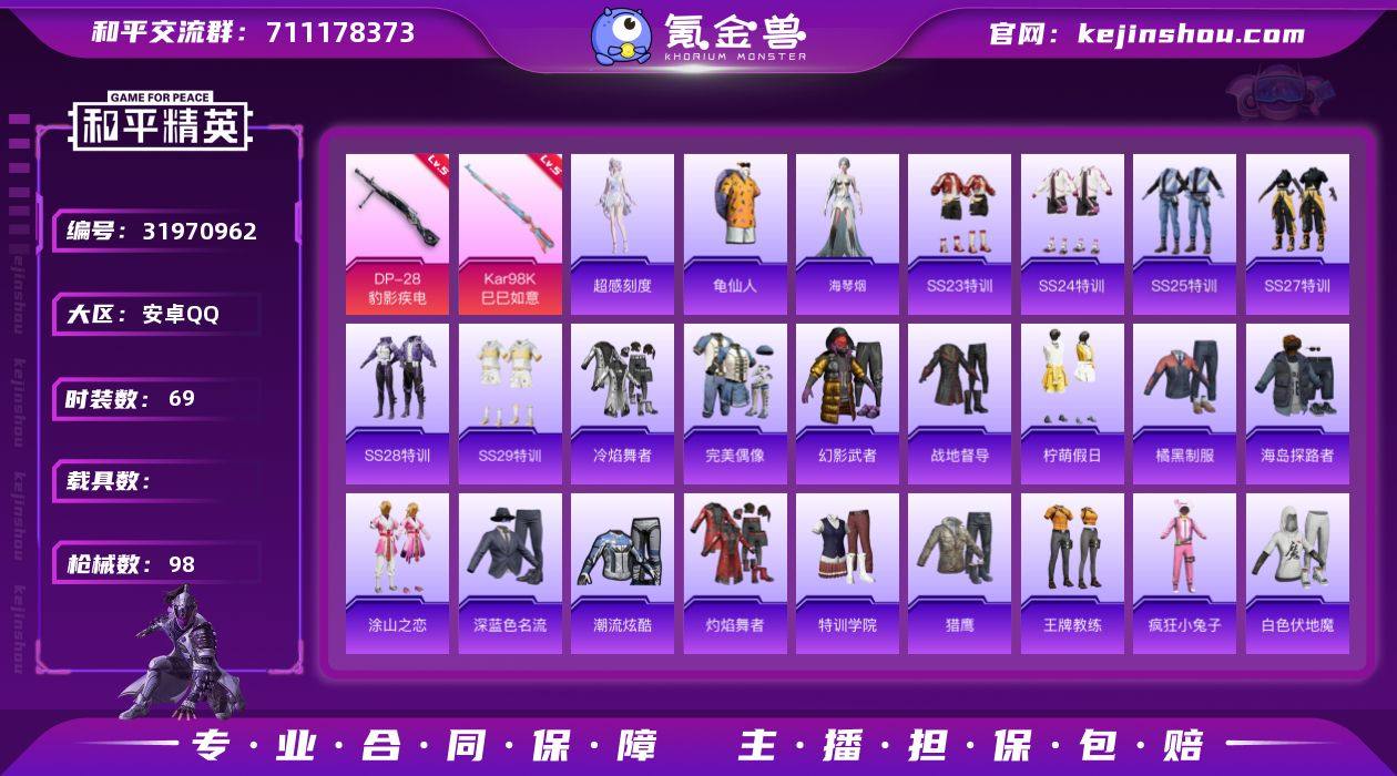 安卓 手Q-0粉装-3特效枪-0载具-1粉色飞行器-24022热力值-1王牌印记-69套装-98枪皮 【热门品类】:套装-龟仙人 【粉色枪皮等级】:Kar98K-巳巳如意(五级),Mk14-福马献瑞(五级),DP-28-豹影疾电(五级) 【粉色枪皮】:Kar98K-巳巳如意,Mk14-福马献瑞,DP-28-豹影疾电 【粉色飞行器】:炫彩糖果飞行器 【粉色降落伞】:绝对恒星降落伞,异瞳寒姬降落伞,炫彩糖果降落伞 【稀有套装】:套装-龟仙人,角色-超感刻度,套装-雪国风尚,套装-炫彩糖果,套装-马上来财,角色-海琴烟 【稀有枪皮】:AUG-冰晶雪宝,AKM-破晓战魂,AKM-龙的传人,M16A4-幻世战舞者,SCAR-L-炫彩节奏,SCAR-L-玉兔迎春,SCAR-L-红色方程式,M416-糯团青竹,M416-红色方程式,M416-蓝色火焰,AUG-天降萌叽,AUG-耀粉歌者,M762-天降萌叽,M762-登顶巅峰,UZI-啾咪啾咪,UZI-红色方程式,UMP45-涂山之恋,UMP45-猪猪侠,UMP45-生命誓言,UMP45-蓝色火焰,Vector-彩虹符号,汤姆逊-天降萌叽,汤姆逊-炫彩节奏,汤姆逊-耀粉歌者,P90-巳巳如意,VSS-虎痴许褚,Mini14-炫彩节奏,S686-红色方程式,S12K-破晓战魂,M249-破晓战魂,M249-糯团青竹,MG3-幻世战舞者,突击盾牌-虎痴许褚,突击盾牌-绝对恒星 【其他套装】:套装-SS23特训,套装-SS24特训,套装-SS25特训,套装-SS27特训,套装-SS28特训,套装-SS29特训,套装-冷焰舞者,套装-完美偶像,套装-幻影武者,套装-战地督导,套装-柠萌假日,套装-橘黑制服,套装-海岛探路者,套装-涂山之恋,套装-深蓝色名流,套装-潮流炫酷,套装-灼焰舞者,套装-特训学院,套装-猎鹰,套装-王牌教练,套装-疯狂小兔子,套装-白色伏地魔,套装-空岛之星,套装-竞技名士,套装-竞技达人朋克,套装-红色运动,套装-绮丽涂鸦,套装-蓝彩潮人,套装-蓝色运动,套装-街头潮人,套装-长空猛禽,套装-青年教官,套装-...
