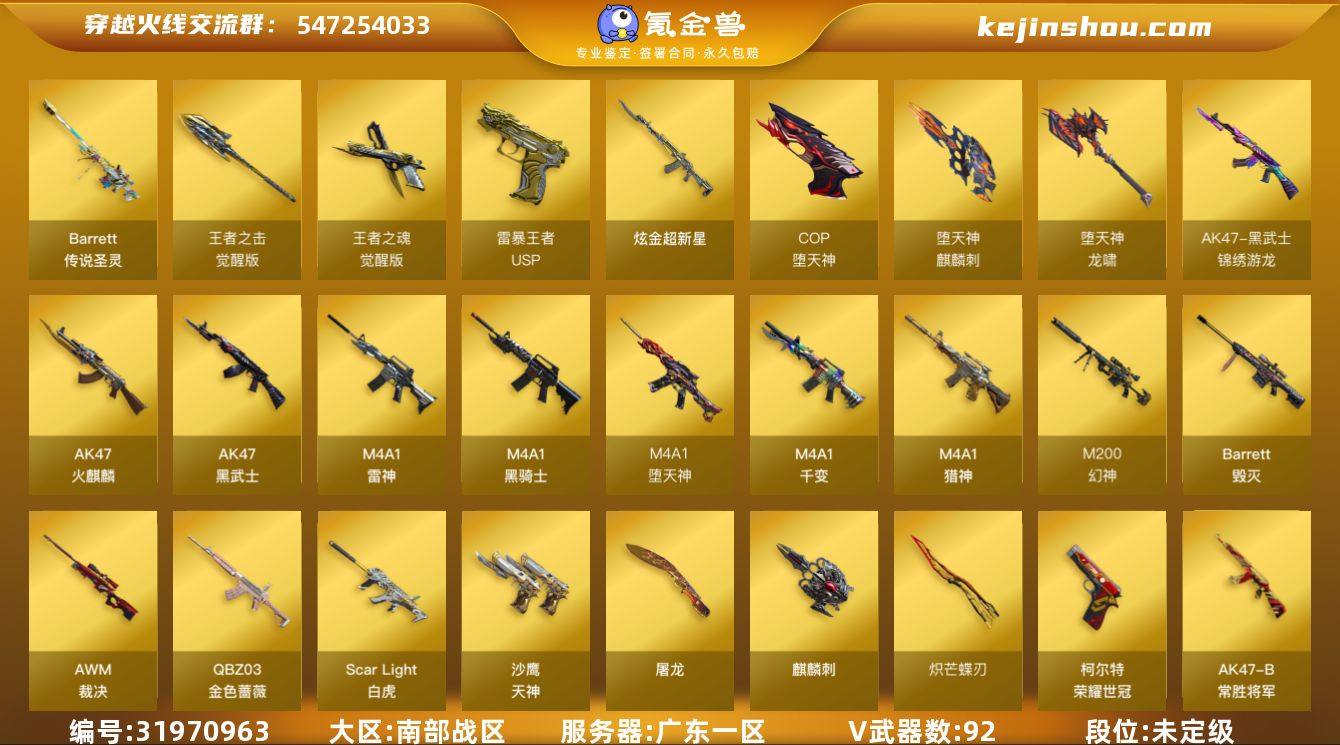 广东一区-97V-11王者武器数-1炫金武器数 【传说武器】:传说圣灵 【热门武器】:传说圣灵,QBZ03-金色蔷薇,Scar Light-白虎,M200-幻神,荣耀世冠-雷神,荣耀世冠-柯尔特*2,M4A1-黑骑士,火麒麟-绝迹,COP-堕天神,炽芒蝶刃*2,金刚伞 【王者炫金武器】:USP-雷暴王者,炫金超新星,王者之魄高爆手雷*3 【音效卡】:M4A1-雷神音效卡,M4A1-黑骑士音效卡 【皮肤】:幻神-AG-CFPLS17冠军,白虎-AG-CFPLS20冠军,QBZ03-AG-CFPLS19冠军,雷神-烈虎皮肤,雷神-荣耀世冠AG,传奇石头-横秒之巅,火麒麟-百城,火麒麟-心动糖果,黑骑士-冠军之势,战神-粉色甜心皮肤,战神-紫绶金章皮肤*2,战神-流金岁月皮肤,AK47-B-常胜将军-曹操,AK47-B-常胜将军-刘备*2,AK47-B-常胜将军-孙权,屠龙-荣耀世冠AG,麒麟刺-甜蜜糖果 皮肤 【角色】:迷迭香,晴雅,暗夜-X,芳心审判者,飞虎队-X,风暴女,虎妞,嘉年华灵狐,兰妹妹,灵狐者-X,龙儿-小淘气,麻雀,潘多拉-X,潘多拉-甜心教官,潜龙队-X,斯沃特-X,蜀雪,铁骑荣耀 【人偶武器】:火麒麟-绝迹,巴雷特-零-水下丽影,AWM-灵狐-15周年嘉年华,迷你生化手雷,闪光弹-小乔,闪光弹-貂蝉,高爆手雷-大乔,灵狐娃娃手雷 【挑战大师】:冰龙粉碎者-白马银枪,神圣爆裂者-末日III*2 【英雄级武器】:M4A1-千变,AK47-火麒麟*2,M4A1-雷神,M4A1-黑骑士,AK47-黑武士,M4A1-堕天神,Scar Light-白虎,黑武士-锦绣游龙,QBZ03-金色蔷薇,M4A1-猎神,AK-47-猩红传说,王者火魄-觉醒版,AK47-B-常胜将军,荣耀世冠-雷神,Barrett-毁灭,AWM-裁决,M200-幻神,沙鹰-天神*5,COP-堕天神,荣耀世冠-柯尔特*2,USP-神工天巧*2,王者之魂-觉醒版,屠龙,麒麟刺-堕天神,麒麟刺*2,炽芒蝶刃*2,唐刀-神工天巧,龙啸-堕天神*2,斩神刀-雷暴,王者之击-觉醒版,高爆