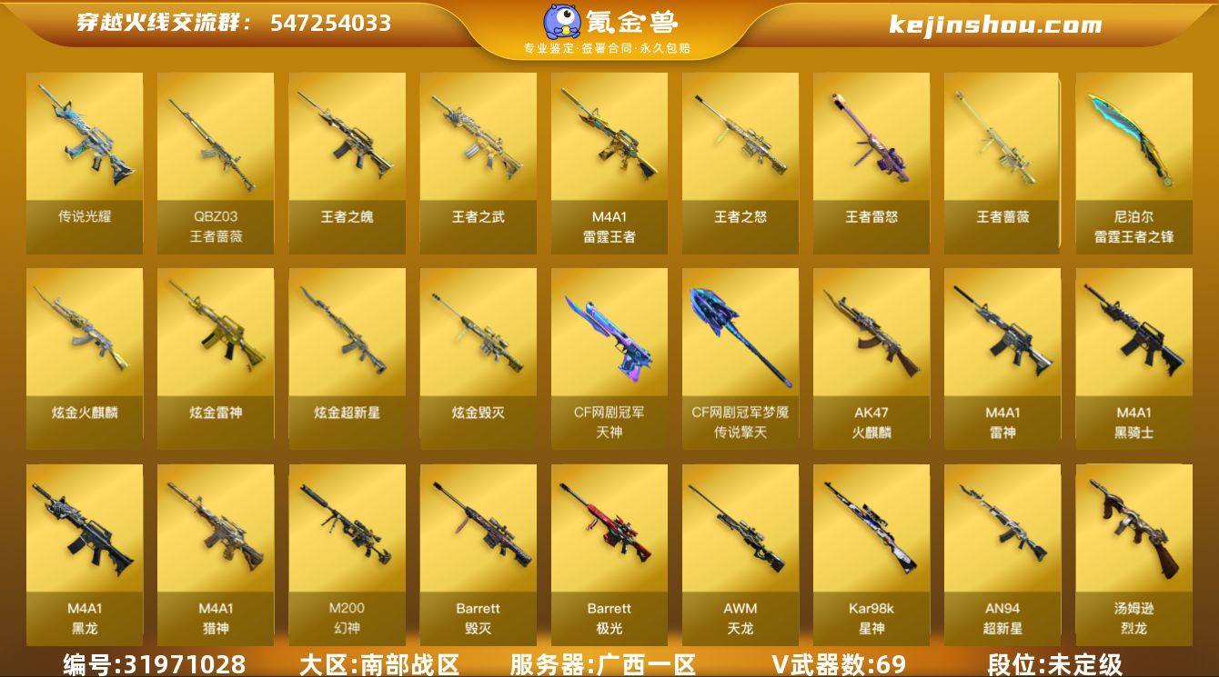 广西一区-88V-28王者武器数-5炫金武器数 【传说武器】:传说光耀 【传说角色】:传说女帝 【热门武器】:传说光耀,M200-幻神,QBZ-03-王者蔷薇,M200-竞技荣光,Kar98K-星神,M4A1-黑骑士,汤姆逊-烈龙*3,雷神-小红,COP-白鲨,USP-雷暴,COP 357-雷霆王者,沙鹰-修罗*4 【王者炫金武器】:王者之武*2,王者之魄,QBZ-03-王者蔷薇,M4A1-雷霆王者,王者之怒,王者蔷薇,王者雷怒,COP 357-雷霆王者,雷霆王者之锋,炫金火麒麟,炫金骑士,炫金雷神,炫金超新星,炫金毁灭 【音效卡】:AK47-火麒麟音效卡,M4A1-黑骑士音效卡,Barrett-毁灭音效卡 【皮肤】:幻神-动感闪耀 皮肤,幻神-纸灯龙皮肤,雷神-暗月,雷神-荣耀之魄,雷神-R.LGD-CFPLS18冠军,雷神-烈虎皮肤,火麒麟-轻羽皮肤,火麒麟-盘古,毁灭耀金皮肤*2,毁灭-星空,毁灭-百城浙江 皮肤,M4A1-黑龙-361,黑骑士耀金皮肤,黑骑士-AG-S4冠军典藏,死神-机甲核心皮肤,战神-粉色甜心皮肤*3,战神-紫绶金章皮肤*13,战神-流金岁月皮肤*12,天龙-能量核心,AWM-天龙-传奇白鲨,极光-能量核心,修罗-冠军之魂,龙啸-青青莓果 皮肤,擎天-秘银,擎天-冠军之击,麒麟刺-荣耀世冠白鲨 【角色】:电竞教官-云悠悠,王者玲珑,王者潘多拉,乔伊教练,暗夜-X,芳心审判者,虎妞,嘉年华灵狐,灵狐者-X,灵狐者-黄金海岸,麻雀,潘多拉-X,潘多拉-甜心教官,蜀雪,铁骑荣耀,兔囡囡,影武者-X,幽 【人偶武器】:雷神-小红,COP-白鲨,天龙-乔伊教练,AWM-灵狐-15周年嘉年华,生化手雷-机甲核心,闪光弹-小乔 【暴走生化】:超级对讲机 【挑战大师】:暴君乱世-超越Max,神圣爆裂者-末日III 【英雄级武器】:AK47-火麒麟*2,M4A1-黑龙,M4A1-雷神*2,M4A1-黑骑士,AN94-超新星,M4A1-猎神,烈火-动感闪耀,王者之武-觉醒版,王者之魄-觉醒版,AK-47-猩红传说*16,A...