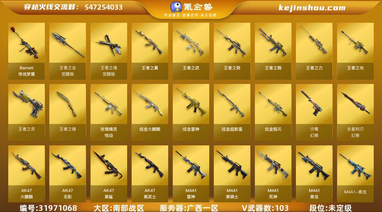 广西一区-111V-15王者武器数-7炫金武器数 【传说武器】:传说梦魇 【热门武器】:传说梦魇,QBZ03-金色蔷薇,HK417-朱雀,M4A1-青龙,M200-竞技荣光,死亡之眼*2,C.A.T,毒蜂,M4A1-黑骑士,汤姆逊-烈龙*9,RPK-盘龙*6,加特林-炼狱*4,火麒麟-绝迹,沙鹰-修罗*6,高爆手雷-幻兽 【王者炫金武器】:王者之戮,王者之翼*2,王者之势,王者之武,玫瑰精灵-悦动,王者之光*2,王者之力,王者之灵,王者之锋,炫金火麒麟,炫金骑士*2,炫金雷神*2,炫金超新星,炫金毁灭 【音效卡】:AK47-火麒麟音效卡*2,M4A1-雷神音效卡,M4A1-黑骑士音效卡,Barrett-毁灭音效卡 【皮肤】:雷神-暗月,雷神-星空,雷神-虎将,雷神-耀金皮肤,雷神-云海游龙皮肤,火麒麟-轻羽皮肤,火麒麟-心动糖果,毁灭-暗月,毁灭-星空,黑龙-能量核心,无影-能量核心,无影耀金皮肤,无影-霓裳皮肤,战神-粉色甜心皮肤,战神-紫绶金章皮肤*3,战神-流金岁月皮肤,天龙-秘银,AWM-天龙-传奇70KG,AWM-天龙-传奇白鲨,极光-能量核心,修罗-能量核心,修罗-星空 【角色】:零,樱,瞳,电竞教官-云悠悠,王者葵-惊若翩鸿,王者复仇,乔伊教练,云海玲珑,炽天使,嘉年华灵狐,斯沃特-X,樱-青春偶像 【人偶武器】:火麒麟-绝迹,天龙-曼陀罗,火麒麟-灵狐,M4A1-雷神-精英刀锋,迷你宝贝,AWM-灵狐-15周年嘉年华,C.A.T,迷你生化手雷*3 【暴走生化】:毒蜂,异变清道夫,双面神,死亡之眼*2,超级对讲机 【英雄级武器】:AK47-火麒麟*3,M4A1-黑龙*2,M4A1-雷神*3,M4A1-黑骑士,AK47-无影,M4A1-死神,AK47-黑武士*2,AK47-黑鲨,M4A1-龙血,M4A1-青龙,HK417-朱雀,M4A1-玫瑰精灵,QBZ03-金色蔷薇,烈火-动感闪耀,王者之幻-觉醒版,AK-47-猩红传说*2,AWM-天龙,Barrett-毁灭*2,Barrett-极光,AWM-裁决,Barrett-朱雀,M200-竞技