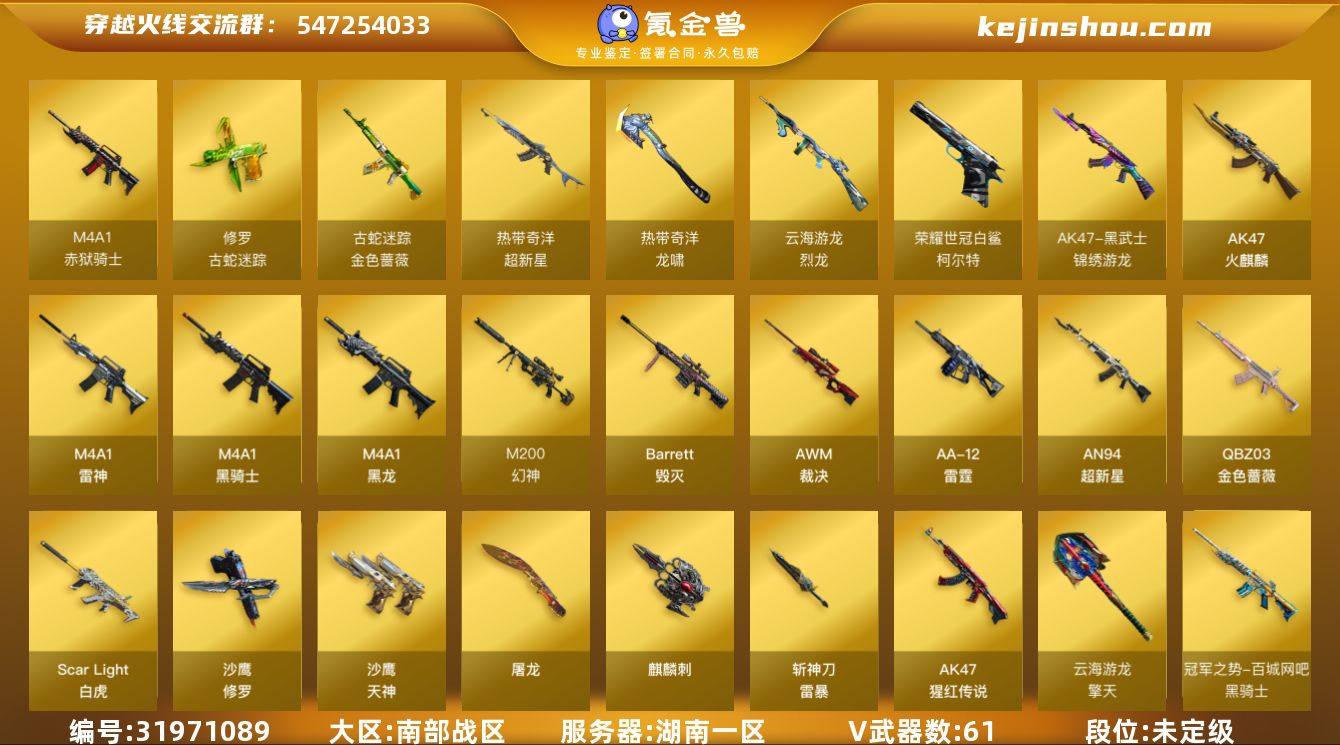 湖南一区-62V-5王者武器数-0炫金武器数 【传说角色】:传说影煞 【热门武器】:QBZ03-金色蔷薇,M14EBR-玄武,Scar Light-白虎,M200-幻神,柯尔特-荣耀世冠白鲨2023,金色蔷薇-古蛇迷踪,修罗-古蛇迷踪,M4A1-黑骑士,毁灭-孙三炮*2,COP-白鲨,沙鹰-修罗 【音效卡】:炼狱-百战金芒-庆典舞曲音效卡 【皮肤】:幻神-宠儿-2021MVP,M200-幻神-N9-2022MVP,QBZ03-巅峰荣耀皮肤,裁决-流光秘银,星神-破竹皮肤,雷神-R.LGD-CFPLS18冠军,雷神-CFS十周年纪念版 皮肤,M4A1-再燃火线,火麒麟-百城,毁灭-SV-CFPLS16冠军,毁灭-百城浙江 皮肤,黑龙-墨子皮肤,黑骑士-冠军之势,黑骑士-AG-S4冠军典藏,屠龙-荣耀之锋,屠龙-QQ会员,屠龙-春桃 皮肤,龙啸-纸灯龙皮肤,轻型军用手斧-再燃火线,麒麟刺-萌杀皮肤,麒麟刺-荣耀世冠白鲨 【角色】:审判者,王者影豹,蛇隐宗,奇洋探员,云海玲珑,暗夜-X,嘉年华灵狐,0号玩家,灵动武士,灵狐者-X,龙儿-小淘气,麻雀,曼陀罗-X,潘多拉-X,蛇姬,斯沃特-X,铁骑荣耀 【人偶武器】:COP-白鲨,毁灭-孙三炮*2,AWM-灵狐-15周年嘉年华 【英雄级武器】:AK47-火麒麟,M4A1-黑龙,M4A1-雷神,M4A1-黑骑士,AN94-超新星,Scar Light-白虎,M14EBR-玄武,黑武士-锦绣游龙,超新星-热带奇洋,金色蔷薇-古蛇迷踪,QBZ03-金色蔷薇,AK-47-猩红传说,Barrett-毁灭,AWM-裁决,M200-幻神,炼狱-百战金芒,烈龙-云海游龙,AA-12-雷霆,沙鹰-修罗,沙鹰-天神*3,柯尔特-荣耀世冠白鲨2023,修罗-古蛇迷踪,屠龙*3,麒麟刺,擎天-云海游龙,龙啸-热带奇洋,斩神刀-雷暴,麒麟刺-百战金芒,高爆手雷-雷暴*2,高爆手雷-幻灵*2,高爆手雷-竞技荣光,高爆手雷-云龙*2,手雷-云海游龙,手雷-热带奇洋,高爆手雷-古蛇迷踪,闪光弹-雷霆,闪光弹-雷暴,闪光弹-幻灵,闪光弹-竞技