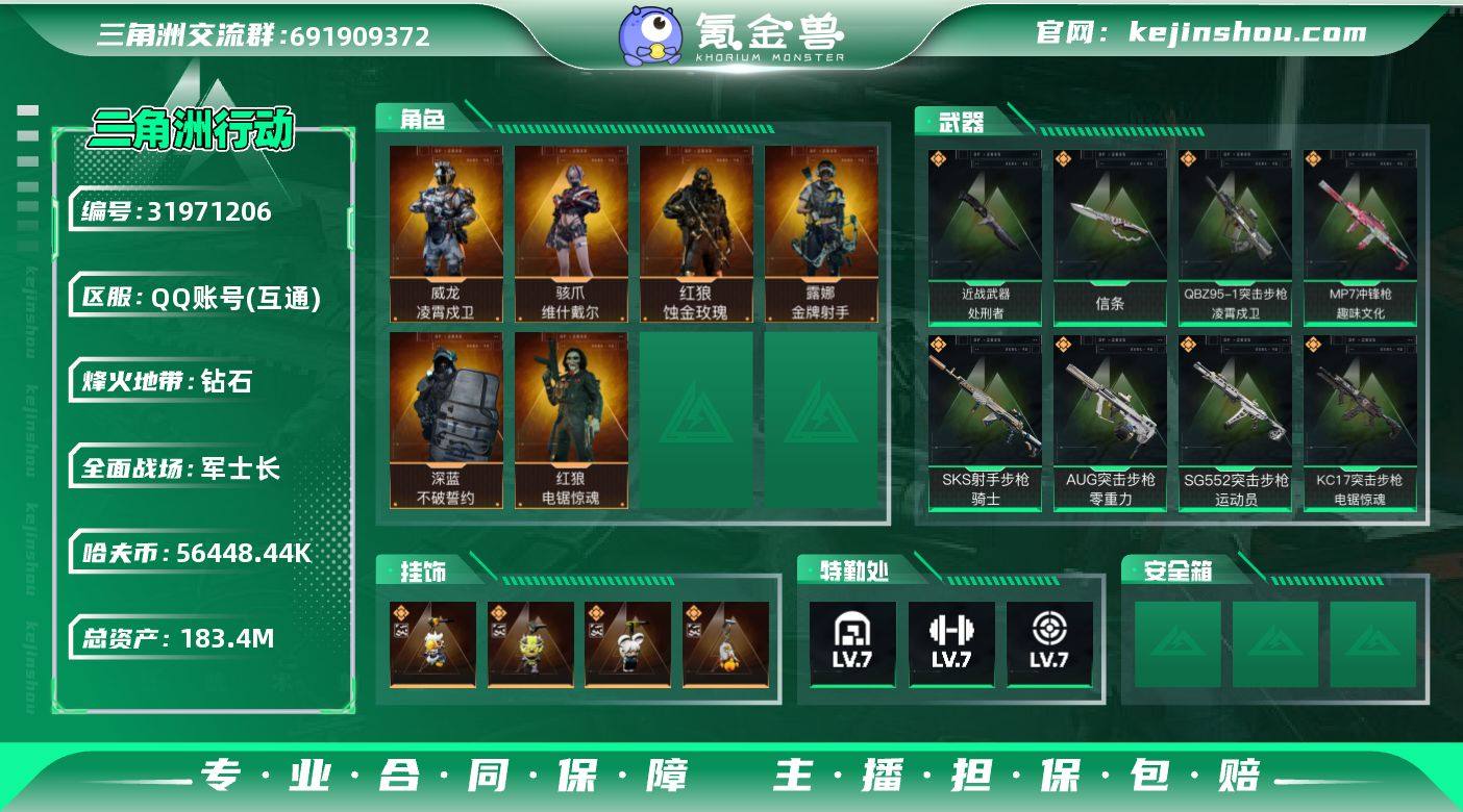 实名:不可二次实名 总资产:183.4M 哈夫币:56448.44K 烽火地带段位:钻石 烽火地带等级:60 全面战场段位:军士长 全面战场等级:36 7级仓库,7级训练中心,7级靶场,6级指挥中心,1级潜水中心,3级防具台,3级工作台,3级制药台,3级技术中心,1级收藏室 战术部门等级:3 战斗部门等级:3 医疗部门等级:3 研发部门等级:2 后勤部门等级:3 曼德尔砖-气象感应:0 曼德尔砖-命运王牌:0 曼德尔砖-电玩高手:0 曼德尔砖-美杜莎:0