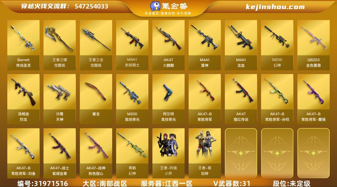 江西一区-36V-5王者武器数-0炫金武器数 【传说武器】:传说圣灵 【热门武器】:传说圣灵,QBZ03-金色蔷薇,M200-幻神,M200-竞技荣光,汤姆逊-烈龙*5,加特林-炼狱 【音效卡】:M200-幻神音效卡 【皮肤】:幻神-青鹤,雷神-烈虎皮肤,战神-粉色甜心皮肤,战神-紫绶金章皮肤,AK47-B-常胜将军-曹操,AK47-B-常胜将军-刘备*2,AK47-B-常胜将军-孙权 【角色】:王者-葵-貂蝉,王者玲珑-小乔,暗夜-X,北极狐-X,初恋灵狐,嘉年华灵狐,娟娟,葵-赛博朋克,莎莎,斯沃特-X,铁骑荣耀 【人偶武器】:AWM-灵狐-15周年嘉年华,迷你生化手雷,闪光弹-小乔,闪光弹-貂蝉,高爆手雷-大乔 【挑战大师】:激光毁灭者III-白马银枪 【英雄级武器】:AK47-火麒麟,M4A1-雷神,M4A1-龙血,QBZ03-金色蔷薇,AK-47-猩红传说,AK47-B-常胜将军,M200-幻神,M200-竞技荣光,加特林-炼狱,汤姆逊-烈龙*5,沙鹰-天神*5,柯尔特-竞技荣光,屠龙,王者之啸-觉醒版*3,王者之击-觉醒版*2,高爆手雷-竞技荣光*2,闪光弹-竞技荣光,烟雾弹-竞技荣光*3,M4A1-赤狱骑士 【道具】:炫彩背包,背包-葫芦兄弟,超级背包,夺命之镰,防化服,金色流光-枪王排位*2,枪王排位29赛季金色流光,防弹头盔,防弹衣,C4工具钳,手雷包 【特殊枪械】:5烈龙,1炼狱