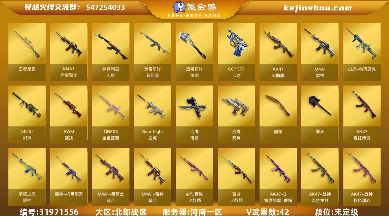 河南一区-41V-1王者武器数-0炫金武器数 【传说角色】:传说影煞 【热门武器】:QBZ03-金色蔷薇,Scar Light-白虎,M200-幻神,白虎-电玩蓝兔,沙鹰-修罗 【王者炫金武器】:王者星霆 【音效卡】:M200-幻神音效卡,Barrett-碧霄极光音效卡 【皮肤】:幻神-宠儿-2021MVP,雷神-暗月,雷神-荣耀之魄,雷神-机甲刑天皮肤,雷神-宇航兔皮肤,火麒麟-平天大圣,火麒麟-百城,火麒麟-心动糖果,黑骑士-暗月*2,战神-粉色甜心皮肤,战神-流金岁月皮肤,AK47-B-常胜将军-曹操,屠龙-星火燎原 【角色】:零·纪元,战地猎狐,奇洋探员,乔伊教练,云海玲珑,暗夜-X,初恋灵狐,芳心审判者,嘉年华灵狐,猎狐者-追月,灵狐者-X,灵狐者-七夕宝贝,麻雀,曼陀罗-X,曼陀罗-礼服,潘多拉-X,潘多拉-甜心教官,斯沃特-X,蜀雪,兔囡囡,樱-战斗天使 【人偶武器】:M4A1-雷神-精英刀锋,AWM-灵狐-15周年嘉年华,迷你艾比,迷你超能女侍 【暴走生化】:超级对讲机 【挑战大师】:冰龙粉碎者-白马银枪,激光毁灭者III-白马银枪 【英雄级武器】:AK47-火麒麟,M4A1-雷神,Scar Light-白虎,无影-神兵利器,超新星-热带奇洋,QBZ03-金色蔷薇,AK-47-猩红传说*3,白虎-电玩蓝兔,AWM-裁决,M200-幻神,沙鹰-修罗,沙鹰-天神,COP 357-云龙,屠龙,擎天,龙啸-热带奇洋,高爆手雷-竞技荣光,高爆手雷-神工天巧,高爆手雷-云龙*5,手雷-热带奇洋,闪光弹-竞技荣光,闪光弹-神工天巧,闪光弹-云龙*6,烟雾弹-竞技荣光*2,烟雾弹-神工天巧*2,M4A1-赤狱骑士,Barrett-碧霄极光 【道具】:亚洲杯纪念炫彩背包,奇洋探员-海龟背包,热带奇洋炫彩背包,虎牙炫彩背包,超级背包,女皇终结者-魔龙之吻,绿色巨人,夺命之镰,防化服*2,金色流光-枪王排位*2,星辰流光-枪王排位,巅峰赛先锋-金色流光,流光-鎏金之域,枪王排位28赛季金色流光,语...