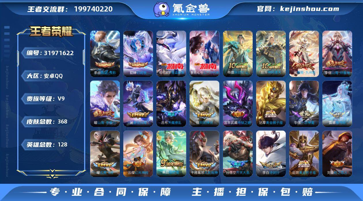 安卓Q-V9-至尊星耀V段位-128英雄-368皮肤-2典藏皮肤-2珍品传说-30传说-109史诗 【英雄全皮】:孙权全皮,戈娅全皮,空空儿全皮,影全皮 【荣耀典藏】:李白鸣剑曳影,貂蝉幻阙歌 【珍品传说】:马可波罗怪盗基德,鲁班七号江户川柯南 【传说皮肤】:杨戬纵目迁山,后羿神树通天,澜愿照九州拓,云缨幻光神枪,桑启鸣野蒿,澜逐花归海,露娜霜月吟,马可波罗妄想实况,干将莫邪画中仙,花木兰燃星之曲,孙悟空齐天大圣,曜山海苍雷引,李信山海炽霜斩,李白诗剑行,百里守约碎云,孙策挚爱之约,赵云淬星耀世,铠绛天战甲,镜炽阳神光,虞姬启明星使,曜云鹰飞将,李信一念神魔,刘备时之恋人,张良黄金白羊座,干将莫邪久胜战神,达摩黄金狮子座,后羿黄金射手座,宫本武藏地狱之眼,吕布天魔缭乱,狄仁杰超时空战士 【限定皮肤】:蒙犽顽岩魄,蔡文姬夏日便利店,虞姬夏日便利店,姜子牙天穹之誓,杨戬破阵退雄兵,狄仁杰阴阳师,赵云皇家上将,墨子降魔,嬴政白昼王子,孙尚香蔷薇恋人,阿轲迷踪丽影,钟无艳超时空战士,扁鹊奇幻香踪,吕布天魔缭乱,元歌无心,甄姬落雪兰心,典韦岱宗,马可波罗暗影游猎,马可波罗妄想实况,狄仁杰魔术师,项羽海滩派对,关羽百相守梦,兰陵王驯魔猎人,花木兰燃星之曲,孙悟空孙行者,孙悟空齐天大圣,李元芳云中旅人,虞姬启明星使,钟馗神迹守卫,杨戬潮玩骑兵,女娲朔望之晖,干将莫邪画中仙,蔡文姬繁星吟游,鬼谷子五谷丰年,百里玄策原初追逐者,沈梦溪大漠名商,裴擒虎李小龙,裴擒虎擒涛扼浪,米莱狄胡桃异想国,云中君纤云弄巧,李信山海炽霜斩,孙策挚爱之约,猪八戒猪悟能,上官婉儿神器万象笔,嫦娥拒霜思,嫦娥暖冬兔眠,曜山海苍雷引,西施玲珑珍味,鲁班大师探海日志,桑启海盐诗旅,暃星界游侠,戈娅驭风魔法,艾琳流音漫舞,司空震地狱燃心,阿古朵江河有灵...