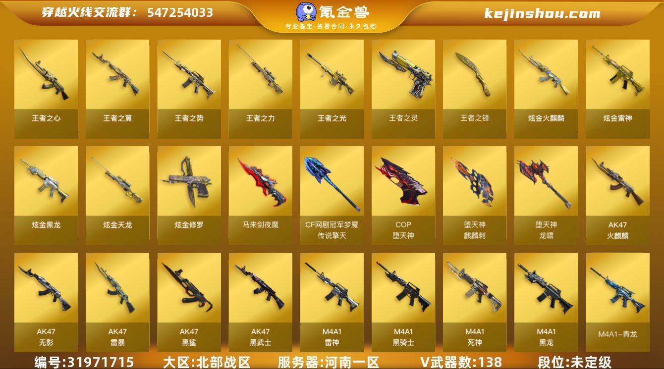 河南一区-150V-14王者武器数-10炫金武器数 【热门武器】:QBZ03-金色蔷薇,HK417-朱雀,M4A1-青龙,M200-幻神,死亡之眼,金色小号,M4A1-黑骑士*4,汤姆逊-烈龙*6,RPK-盘龙,加特林-炼狱*3,斯泰尔-蝴蝶,降世魔童,USP-雷暴,COP-堕天神,沙鹰-修罗*7 【王者炫金武器】:王者之翼,王者之势,王者之心,王者之光*2,王者之力,王者之灵,王者之锋,炫金火麒麟,炫金骑士*2,炫金黑龙,炫金雷神*3,炫金武士,炫金天龙,炫金修罗 【音效卡】:AK47-火麒麟音效卡,M4A1-雷神音效卡,M4A1-黑龙音效卡,M4A1-黑骑士音效卡,Barrett-毁灭音效卡*2,沙鹰-修罗-盛典舞曲音效卡*2,炼狱-百战金芒-庆典舞曲音效卡 【皮肤】:幻神-宠儿-2021MVP,M200-幻神-N9-2022MVP,裁决-运输船 皮肤,雷神-暗月,雷神-荣耀之魄,雷神-星空*2,雷神-宠儿-2019MVP,M4A1-再燃火线,火麒麟-雷神,火麒麟-冠军之心,火麒麟-轻羽皮肤,火麒麟-平天大圣,毁灭-荣耀之怒,毁灭耀金皮肤,毁灭-星空,毁灭-BEAN-2020MVP,毁灭-黑大圣皮肤,黑龙-能量核心,黑骑士-冠军之势,无影耀金皮肤,死神-机甲核心皮肤,AK47-黑武士-361,战神-粉色甜心皮肤*2,战神-紫绶金章皮肤*4,战神-流金岁月皮肤*3,天龙-能量核心,AWM-天龙-传奇白鲨,极光-能量核心*2,修罗耀金皮肤,屠龙-荣耀之锋*2,屠龙-惊鸿 皮肤,轻型军用手斧-再燃火线,擎天-蒸汽钟表 皮肤 【角色】:魅影,春,零·纪元,王者-零,云海玲珑,葵-阿尔法武装,空,暗夜-X,初恋灵狐,芳心审判者,风暴女,娟娟,兰妹妹,猎狐者-追月,灵狐者-X,灵狐者-黄金海岸,麻雀,玫瑰花神,潘多拉-X,潘多拉-甜心教官,潜龙队-X,邱刚敖,青霞仙子,斯沃特-X,蜀雪,铁骑荣耀,兔囡囡,雪莉杨,樱-战斗天使,樱-缤纷夏日,职业选手 【人偶武器】:斯泰尔-蝴蝶,M37-葵,COP-旗袍,迷你深渊冰龙,迷...
