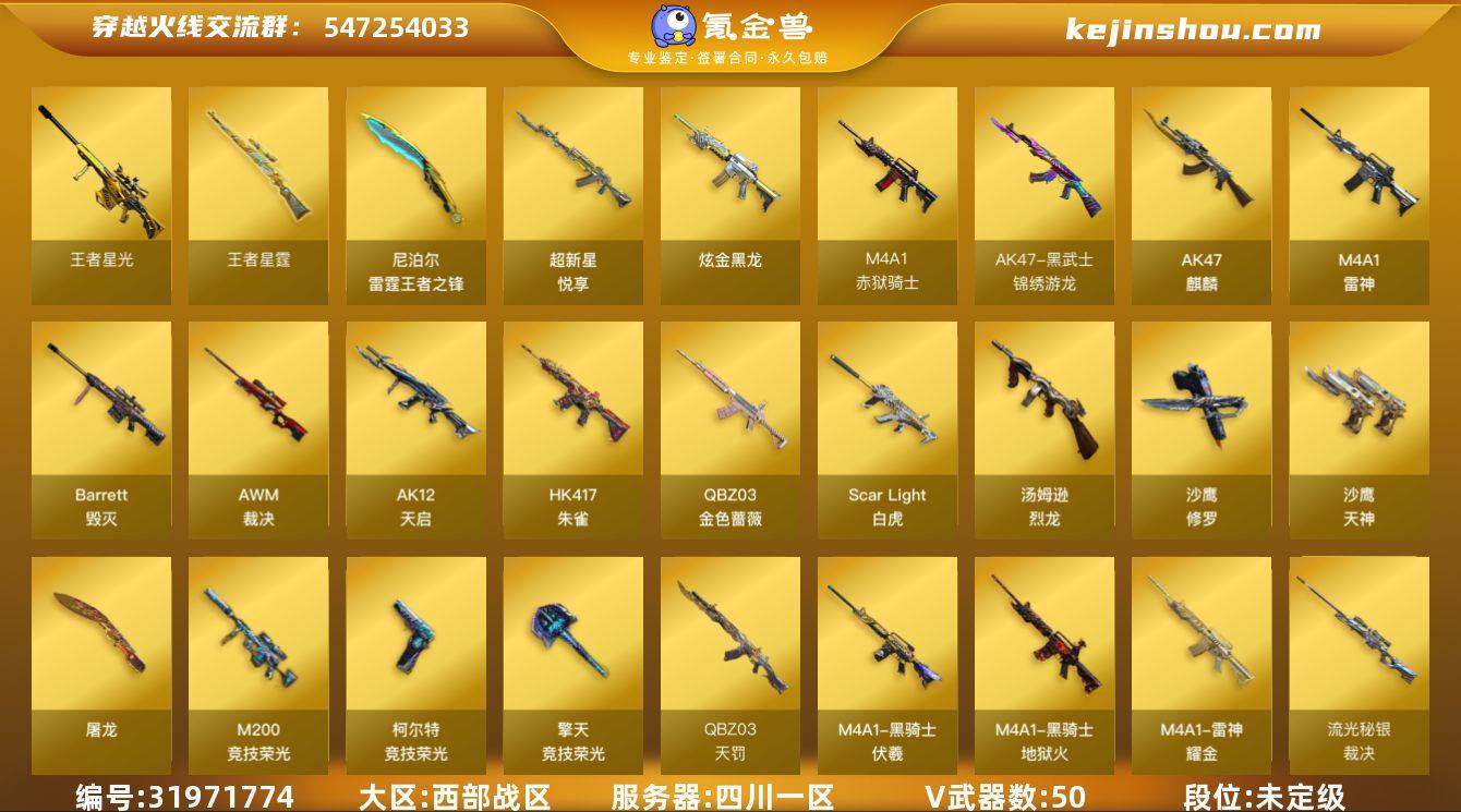 四川一区-72V-24王者武器数-1炫金武器数 【传说角色】:传说星骇 【热门武器】:QBZ03-金色蔷薇,Scar Light-白虎,HK417-朱雀,M200-竞技荣光,汤姆逊-烈龙*2,沙鹰-修罗*2 【王者炫金武器】:超新星-悦享,王者星霆,王者星光,炽渊之怒,雷霆王者之锋*2,炫金黑龙 【音效卡】:屠龙-云海游龙音效卡,M4A1-雷神音效卡,QBZ03-金色蔷薇音效卡,AWM-裁决音效卡,Scar Light-白虎音效卡 【皮肤】:幻神-荣耀世冠EP 皮肤,白虎-百战金芒 皮肤,金色蔷薇-破浪逐光 皮肤,QBZ03-荣耀世冠EP 皮肤,裁决-流光秘银,裁决-叶芒苍灵 皮肤,雷神-耀金皮肤,雷神-宇航兔皮肤,M4A1-再燃火线,毁灭-暗月,毁灭-SV-CFPLS16冠军,毁灭-虹光风暴 皮肤,黑骑士-地狱火,黑骑士-伏羲,修罗-冠军之魂,屠龙-星火燎原,屠龙-破浪逐光 皮肤,轻型军用手斧-再燃火线 【角色】:电竞教官-云悠悠,晴雅,迅捷虹喵,零·纪元,王者炫,修道士,葵-阿尔法武装,暗夜-X,北极狐-X,芳心审判者,飞虎队-X,风暴女,兰-新年限定,灵狐者-X,潘多拉-X,潘多拉-甜心教官,幽 【人偶武器】:星神-炽天使,异变清道夫-蛇影双骄,迷你律动酷熊,夺魂,迷你艾比,迷你超能女侍 【暴走生化】:超级对讲机 【英雄级武器】:AK47-麒麟,M4A1-雷神*2,AK12-天启,HK417-朱雀,Scar Light-白虎,QBZ03-天罚,黑武士-锦绣游龙,QBZ03-金色蔷薇,王者之势-觉醒版,白虎之魄-觉醒版,HK417-朱雀-电竞之星,机械迷城-穹宇,Barrett-毁灭,AWM-裁决,M200-竞技荣光,Barrett-金色蔷薇,Barrett-雷霆王者-觉醒版,炼狱-百战金芒,汤姆逊-烈龙*2,沙鹰-修罗*2,沙鹰-天神*4,COP 357-雷霆王者-觉醒版,柯尔特-竞技荣光,柯尔特-荣耀世冠EP*2,屠龙,擎天-竞技荣光*3,麒麟刺-百战金芒,雷霆王者之锋-觉醒版,丛林匕首-玄豹,高爆手雷-竞技荣光*2,高爆手雷-雷霆王...