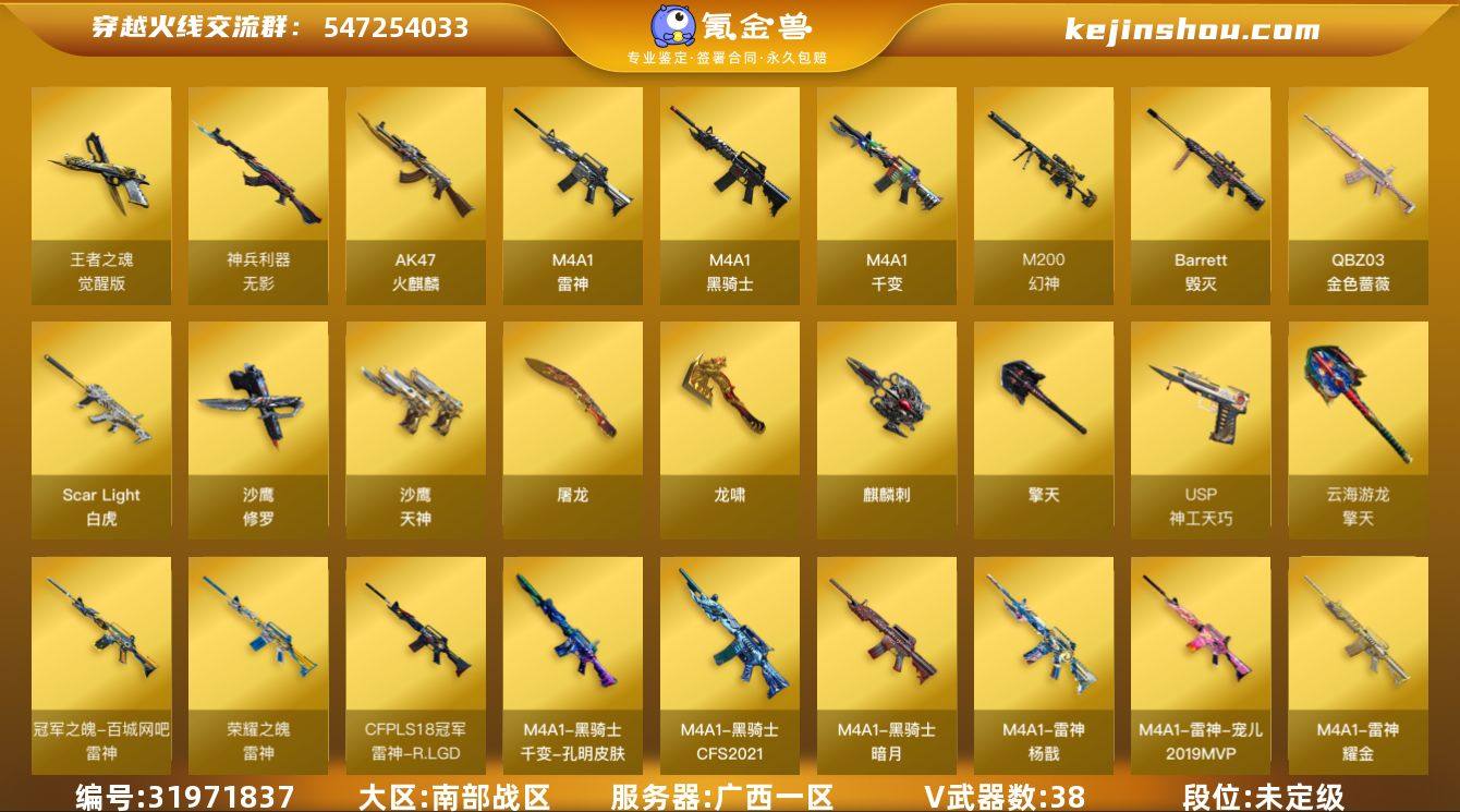 广西一区-45V-4王者武器数-0炫金武器数 【热门武器】:QBZ03-金色蔷薇,M14EBR-玄武,Scar Light-白虎,M200-幻神,M4A1-黑骑士,沙鹰-修罗*2 【音效卡】:M4A1-雷神音效卡,M4A1-黑龙音效卡,M4A1-黑骑士音效卡,Barrett-毁灭音效卡,QBZ03-金色蔷薇音效卡,Scar Light-白虎音效卡 【皮肤】:幻神-CFS2022,雷神-荣耀之魄,M4A1-雷神-CFS 2019,雷神-耀金皮肤,雷神-冠军之魄,雷神-宠儿-2019MVP,雷神-杨戬,雷神-R.LGD-CFPLS18冠军,火麒麟-平天大圣,火麒麟-盘古,火麒麟-斗鱼平台皮肤,火麒麟-百城,火麒麟-心动糖果,毁灭-荣耀之怒,毁灭-BEAN-2020MVP,毁灭-黑大圣皮肤,毁灭-风暴,M4A1-千变-孔明皮肤,黑骑士-暗月*2,黑骑士-CFS2021,无影-暗月,AK47-B-常胜将军-曹操,AK47-B-常胜将军-孙权,屠龙-春桃 皮肤,龙啸-冠军之啸,擎天-秘银,擎天-冠军之击 【角色】:魅影,鹰,王者-葵-貂蝉,王者玲珑,云海玲珑,芳心审判者,风暴女,嘉年华灵狐,龙儿,龙儿-小淘气,潘多拉-X,斯沃特-X,甜心偶像,职业选手 【人偶武器】:天龙-曼陀罗,AWM-灵狐-15周年嘉年华,迷你牛魔王,迷你牛牛,迷你超能女侍 【暴走生化】:超级对讲机 【挑战大师】:冰龙粉碎者-白马银枪,激光毁灭者III-白马银枪 【英雄级武器】:M4A1-千变,AK47-火麒麟*2,M4A1-雷神,M4A1-黑骑士,Scar Light-白虎,M14EBR-玄武,无影-神兵利器,QBZ03-金色蔷薇,王者之武-觉醒版,王者白虎-觉醒版,Barrett-毁灭,M200-幻神,王者星神-觉醒版,沙鹰-修罗*2,沙鹰-天神,USP-神工天巧,王者之魂-觉醒版,屠龙*2,龙啸,擎天,麒麟刺,擎天-云海游龙,高爆手雷-幻灵*2,高爆手雷-竞技荣光,高爆手雷-神工天巧*4,手雷-云海游龙,闪光弹-神工天巧*4,烟雾弹-竞技荣光,烟雾弹-神工天巧*2 【道具】:CFS限