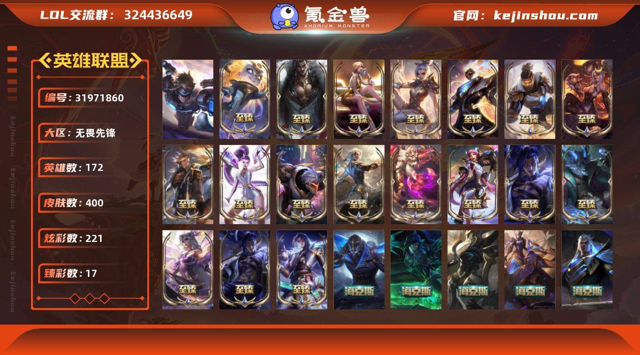 t36905【无畏先锋】400皮肤 221炫彩 17臻彩 30神话/50限定/44传说/172英雄 账号等级:681 【重要头像】云顶战斗学院伊泽瑞尔 爱意绵绵 心型钥匙 奥瑞利安萌尔 大家伙 春晖神女拉克丝 我麦是开的么 KDA萨勒芬妮 北极星神黛安娜 北极星神黛安娜炫彩 可爱安妮 至臻幻灵战斗猫金克丝 【重要皮肤】永恒星灵佐伊至臻 狼神英灵斯维因至臻 心之钢永恩至臻 墨之影武者亚索至臻 花仙使者卡特琳娜至臻 北极星使者沃里克至臻 至高天奎桑提至臻 幻灵战斗猫金克丝至臻 未来战士卢锡安至臻 灵能特工伊泽瑞尔至臻 源计划阴劫至臻 黑夜使者凯隐至臻 神龙尊者均衡之龙沃利贝尔至臻 KDA二代卡莎至臻 KDA伊芙琳至臻 烈焰美人薇恩至臻 玉剑传说武剑仙至臻 未来战士锤石至臻 未来战士锤石2022至臻 殿堂传奇乐芙兰 灰烬骑士派克 海克斯科技瑟庄妮 海克斯科技斯维因 零之枪骑赫卡里姆 摄魂使者薇恩 双城之战2孤勇者艾克 胜利之王泰达米尔 胜利巨口克格莫 玉剑传说舞龙卫 天龙之子斯莫德 广寒仙子嫦娥 胜利女神瑟庄妮 胜利之剑亚托克斯 双城之战2指挥官凯特琳 双城之战2微光实验室辛吉德 北极星神黛安娜 冰雪女神辛德拉 魄罗骑士瑟庄妮 泳池派对奥莉安娜 泳池派对塔莉垭 泳池派对蕾欧娜 iG艾瑞莉娅 SKTT1辛德拉 SKTT1卡莉丝塔 SKTT1瑞兹 SKTT1雷克顿 SSW泰隆 SKTT1贾克斯 SKTT1劫 SKTT1李青 暗杀星蒙多 暗杀星慎 Fnatic迦娜 Fnatic古拉加斯 冠军典狱长锤石 鬼影森森茂凯 鬼影重重魔腾 惊悚派对费德提克 密林猎手提莫 南瓜头费德提克 圣诞精灵崔丝塔娜 圣诞老人古拉加斯 圣诞玩偶波比 圣诞驯鹿克格莫 糖果使徒费德提克 无头骑士赫卡里姆 雪默丁格 野兽猎人德莱文 野兽猎人瑟庄妮 野兽猎人泰达米尔 征服者卡尔玛 暗影沃里克 波比的巧克力工坊 都铎王朝...