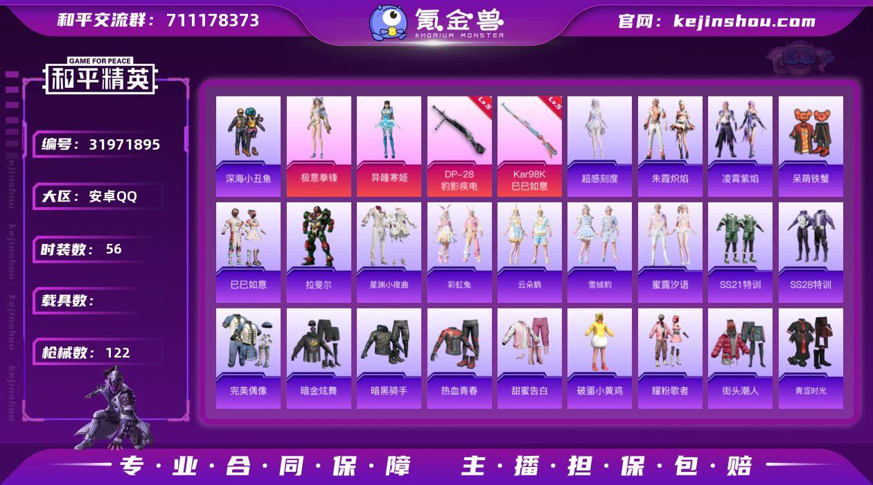 安卓 手Q-2粉装-4特效枪-0载具-2粉色飞行器-28158热力值-2王牌印记-56套装-122枪皮 【热门品类】:套装-深海小丑鱼 【粉色套装】:角色-异瞳寒姬,粉装-极意拳锋 【粉色枪皮等级】:ACE32-萌骑漫游(五级),Kar98K-巳巳如意(五级),Mk14-福马献瑞(五级),DP-28-豹影疾电(五级) 【粉色枪皮】:ACE32-萌骑漫游,Kar98K-巳巳如意,Mk14-福马献瑞,DP-28-豹影疾电 【粉色飞行器】:炫彩糖果飞行器,极意拳锋飞行器 【粉色降落伞】:绝对恒星降落伞,幻彩电音降落伞,冷漠罗丽降落伞,炫彩糖果降落伞 【稀有套装】:套装-巳巳如意,角色-超感刻度,套装-雪国风尚,套装-炫彩糖果,套装-马上有钱,角色-拉斐尔,套装-星渊小夜曲,套装-彩虹兔,套装-云朵鹅,套装-雪绒豹,套装-蜜露汐语,套装-朱霞炽焰,套装-凌霄紫焰,套装-雨过天青,套装-红釉青花 【稀有枪皮】:AUG-冰晶雪宝,AKM-破晓战魂,AKM-缤纷海域,AKM-龙的传人,M16A4-幻世战舞者,M16A4-快乐主宰,M16A4-红色方程式,M16A4-蓝色火焰,SCAR-L-炫彩节奏,SCAR-L-红色方程式,M416-红色方程式,M416-蓝色火焰,AUG-耀粉歌者,AUG-绝对恒星,M762-云朵鹅,M762-登顶巅峰,ARX-凌霄紫焰,UZI-天降萌叽,UZI-红色方程式,UMP45-夜灯,UMP45-快乐主宰,UMP45-生命誓言,UMP45-蓝色火焰,Vector-生命誓言,汤姆逊-耀粉歌者,汤姆逊-幻星舰长,JS9-凌霄紫焰,P90-飞驰魅影,P90-巳巳如意,Kar98K-洛神天依,Kar98K-红色方程式,SKS-迅猛狂鲨,Mini14-穿刺龙虾,Mini14-耀粉歌者,AMR-喜羊羊与灰太狼,SVD-云朵鹅,S686-红色方程式,S686-巳巳如意,S12K-破晓战魂,DBS-第五大道,DBS-幻彩电音,DBS-月影灵韵,SPAS-12-云朵鹅,M249-破晓战魂,M249-糯团青竹,DP-28-彩虹符号,MG3-幻世战舞者,MG-36-凌霄紫焰,P92-凌霄紫焰,R45-幻彩电音,沙漠之鹰-云朵鹅,大砍刀...