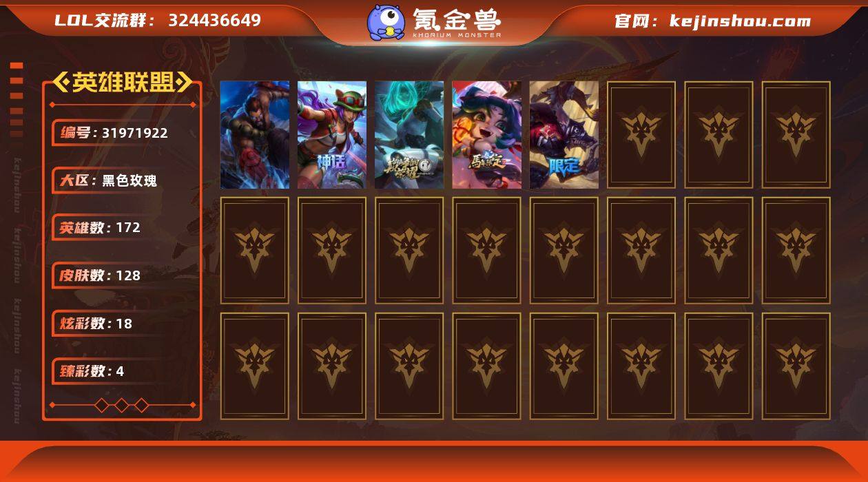 t36856【黑色玫瑰】 128皮肤 18炫彩 4臻彩 3神话/8限定/14传说/172英雄 账号等级:406 【重要头像】美猴王孙悟空 【重要皮肤】龙马烈焰波比 胜利女神奥莉安娜 胜利枪神格雷福斯 胜利之剑亚托克斯 南瓜头费德提克 都铎王朝图奇 十五周年纪念希维尔 十周年纪念安妮 源代码乐芙兰 灵魂守卫乌迪尔 【传说皮肤】欧米伽小队幽灵特工 黎明使者永恩 霸天异形卡兹克 神龙尊者夜月幻龙亚索 源计划超体莫德凯撒 女帝卡特琳娜 约德尔国队长提莫 星之守护者金克丝 冰川巨兽墨菲特 源计划净化薇恩 宇航员诺提勒斯 最终BOSS维迦 灌篮高手德莱厄斯 源计划林易 【重要炫彩】无畏骑士瑟庄妮赤子初心 霸天异形卡兹克掠空魅影 泳池派对辛德拉荔枝枝连击
