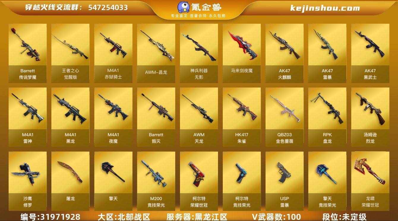 黑龙江区-110V-2王者武器数-0炫金武器数 【传说武器】:传说梦魇 【热门武器】:传说梦魇,QBZ03-金色蔷薇,HK417-朱雀,M200-竞技荣光,死亡之眼,荣耀世冠-火麒麟,荣耀世冠-雷神*2,QBZ03-街机,荣耀世冠-柯尔特,C.A.T,汤姆逊-烈龙*6,RPK-盘龙,加特林-炼狱,斯泰尔-蝴蝶,USP-雷暴*2,沙鹰-修罗*2,荣耀世冠-龙啸 【音效卡】:修罗-云海游龙音效卡,屠龙-云海游龙音效卡,AK47-火麒麟音效卡,M4A1-雷神音效卡,Barrett-毁灭音效卡,炼狱-百战金芒-庆典舞曲音效卡 【皮肤】:雷神-星空,雷神-耀金皮肤,雷神-冠军之魄,雷神-宠儿-2019MVP,雷神-荣耀世冠AG,M4A1-再燃火线,火麒麟-华夏之心,火麒麟-荣耀世冠AG,火麒麟-心动糖果,毁灭-暗月,毁灭-荣耀之怒,毁灭-战神张飞,毁灭-英雄计划 皮肤,黑龙-墨子皮肤,死神-机甲核心皮肤,AWM-天龙-传奇70KG,AWM-天龙-传奇白鲨,屠龙-荣耀世冠AG,轻型军用手斧-再燃火线 【角色】:春,凌霄,电竞教官-云悠悠,战地猎狐,王者-瞳-闭月羞花,王者葵-惊若翩鸿,王者潘多拉,奇洋探员,乔伊教练,葵-阿尔法武装,暗夜-X,芳心审判者,风暴女*2,虎妞,嘉年华灵狐,兰-空鹰,灵狐-花神,灵狐者-X,灵狐者-七夕宝贝,灵狐者-职业经理,龙儿,麻雀,曼陀罗-X,萌儿,潘多拉-X,潘多拉-甜心教官,斯沃特-X,蜀雪,铁骑荣耀 【人偶武器】:M4A1-雷神-精英刀锋,迷你救赎猎手,斯泰尔-蝴蝶,街机小灰机,AWM-灵狐-15周年嘉年华,M37-葵,C.A.T,迷你深渊冰龙*2,迷你牛魔王,迷你波特博士*3,夺魂,迷你火种,生化手雷-机甲核心*2,深渊终结者手雷*2,迷你艾比,迷你巨石泰坦-魔花研究所 【暴走生化】:死亡之眼,超级对讲机 【挑战大师】:冰龙粉碎者-白马银枪,激光毁灭者III-白马银枪,VEPR-12-金魔,激光毁灭者III,神圣爆裂者-末日III*2 【英雄级武器】:AK47-火麒麟...