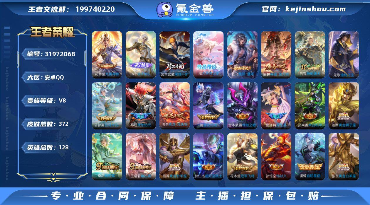 安卓Q-V8-至尊星耀I段位-128英雄-372皮肤-1典藏皮肤-1无双-3珍品传说-19传说-106史诗 【英雄全皮】:刘禅全皮,元歌全皮,老夫子全皮,孙权全皮,敖隐全皮,空空儿全皮 【荣耀典藏】:花木兰九霄神辉 【无双皮肤】:李白碎月剑心 【珍品传说】:张飞兔狲蓬尾,瑶大耳狗之梦,宫本武藏黑崎一护 【传说皮肤】:貂蝉神骥聚万邦,后羿神树通天,元歌诡秘之主,公孙离云诺千山,王昭君映山客,桑启鸣野蒿,孙策乘龙淬吴钩,马超琥珀纪元,澜逐花归海,夏洛特浮生妄,虞姬启明星使,张良黄金白羊座,达摩黄金狮子座,花木兰冠军飞将,后羿黄金射手座,孙尚香末日机甲,宫本武藏地狱之眼,孙悟空地狱火,狄仁杰超时空战士 【限定皮肤】:暃埋骨钱,蒙犽顽岩魄,大乔绒语心约,姜子牙天穹之誓,杨戬破阵退雄兵,李白谪仙醉月,狄仁杰阴阳师,赵云皇家上将,墨子神迹守卫,妲己时之彼端,孙尚香蔷薇恋人,鲁班七号狮舞东方,鲁班七号乒乒小将,高渐离死亡摇滚,芈月幻夜卜梦,元歌云间偶戏,元歌无心,典韦岱宗,马可波罗暗影游猎,狄仁杰魔术师,狄仁杰万华元夜,达摩星际陆战队,达摩沙漠行僧,项羽海滩派对,老夫子圣诞老人,老夫子醍醐杖,老夫子航海奇遇记,安琪拉魔法小厨娘,程咬金演武夺筹,王昭君午后时光,兰陵王金庭之子,李元芳匿光侦查者,李元芳云中旅人,虞姬启明星使,钟馗驱傩正仪,杨玉环遇见飞天,雅典娜单词大作战,雅典娜黎明之约,太乙真人华丽摇滚,鬼谷子原初探秘者,鬼谷子五谷丰年,黄忠火炮绅士,苏烈千军破阵,百里玄策原初追逐者,梦奇顽趣,沈梦溪大漠名商,裴擒虎李小龙,裴擒虎擒涛扼浪,狂铁电玩高手,米莱狄胡桃异想国,云中君纤云弄巧,上官婉儿梁祝,嫦娥拒霜思,蒙犽狂想玩偶喵,鲁班大师探海日志,桑启海盐诗旅,夏洛特浮生妄,艾琳女武神,艾琳流音漫舞,司空震地狱燃心,阿古朵江...