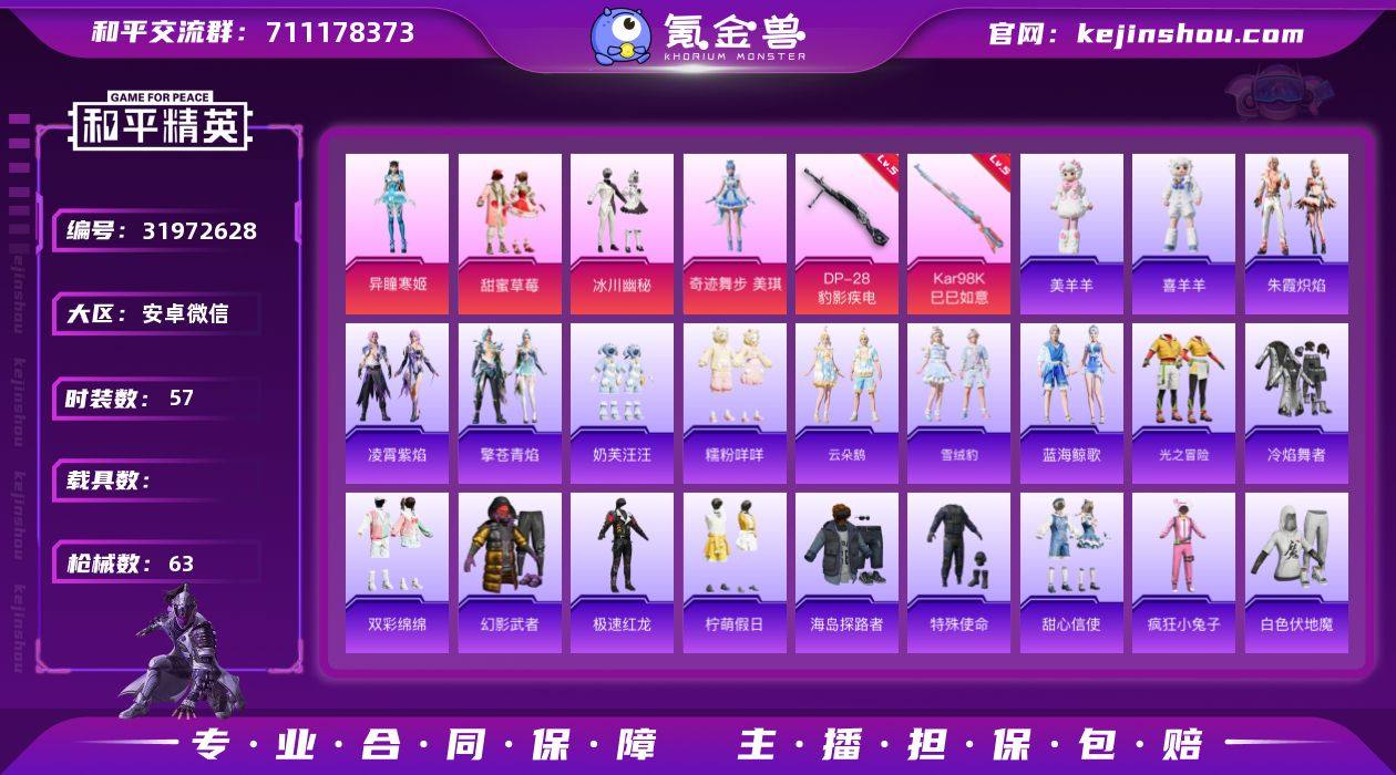 安卓 微信-4粉装-2特效枪-0载具-2粉色飞行器-19555热力值-2王牌印记-57套装-63枪皮 【热门品类】:套装-糯粉咩咩 【粉色套装】:粉装-甜蜜草莓,粉装-冰川幽秘,角色-奇迹舞步 美琪,角色-异瞳寒姬 【粉色枪皮等级】:Kar98K-巳巳如意(五级),DP-28-豹影疾电(五级) 【粉色枪皮】:Kar98K-巳巳如意,DP-28-豹影疾电 【粉色飞行器】:炫彩糖果飞行器,极意拳锋飞行器 【粉色降落伞】:第五大道降落伞,星穹咏叹调降落伞,绯穹魔姬降落伞,喜羊羊与灰太狼降落伞,炫彩糖果降落伞 【稀有套装】:套装-炫彩糖果,套装-云朵鹅,套装-雪绒豹,套装-蓝海鲸歌,套装-朱霞炽焰,套装-凌霄紫焰,套装-擎苍青焰,玩偶服-美羊羊,玩偶服-喜羊羊 【稀有枪皮】:AKM-破晓战魂,SCAR-L-夜灯,SCAR-L-炫彩节奏,M416-红色方程式,GROZA-荧海星豚,AUG-耀粉歌者,M762-天降萌叽,M762-云朵鹅,ARX-凌霄紫焰,UZI-天降萌叽,Vector-生命誓言,汤姆逊-天降萌叽,汤姆逊-甜梦小狐,JS9-凌霄紫焰,Kar98K-影袭,AWM-奇迹舞步,SLR-甜蜜草莓,AMR-喜羊羊与灰太狼,SVD-云朵鹅,S1897-荧海星豚,S12K-暖熊萌萌,DBS-第五大道,DBS-荧海星豚,SPAS-12-云朵鹅,M249-彩虹符号,DP-28-彩虹符号,MG3-幻世战舞者,MG-36-凌霄紫焰,P92-凌霄紫焰,沙漠之鹰-云朵鹅,大砍刀-云朵鹅,平底锅-凌霄紫焰 【其他套装】:套装-光之冒险,套装-冷焰舞者,套装-双彩绵绵,套装-幻影武者,套装-极速红龙,套装-柠萌假日,套装-海岛探路者,套装-特殊使命,套装-甜心信使,套装-疯狂小兔子,套装-白色伏地魔,套装-破晓战魂,套装-破蛋小黄鸡,套装-糯粉咩咩,套装-红色运动,套装-绮丽涂鸦,套装-绯格组合,套装-耀粉歌者,套装-蓝彩潮人,套装-雪鹰学院,套装-青涩时光,套装-魅力单车,套装-黄色名流,套装-黄色运动,套装-黑色伏地魔,套装-奶芙汪汪,...