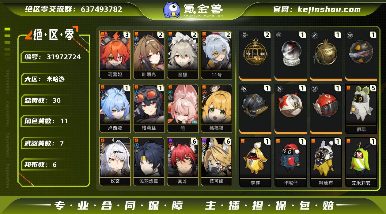 冒险等级:58 总黄数:30 五星角色数:11 菲林底片数量:0 菲林数量:153 加密母带数量:0 3命珂蕾妲,2命叶瞬光,2命丽娜,2命「11号」,1命卢西娅,1命格莉丝,0命照,0命橘福福,0命仪玄,0命浅羽悠真 6命真斗,6命波可娜,6命露西,6命派派,6命比利,6命本,6命安比,6命妮可,6命可琳,5命潘引壶,5命安东,4命赛斯,1命苍角 2精青溟笼舍,1精云霓孤光,1精铸梦炉歌,1精硫磺石,1精拘缚者,1精燃狱齿轮,1精钢铁肉垫 5精狮耶,1精芽芽,1精咔嚓仔,1精飚速布,1精艾米莉安,1精阿全 白心旧影,晴澜双迹套装,漪光夜曲