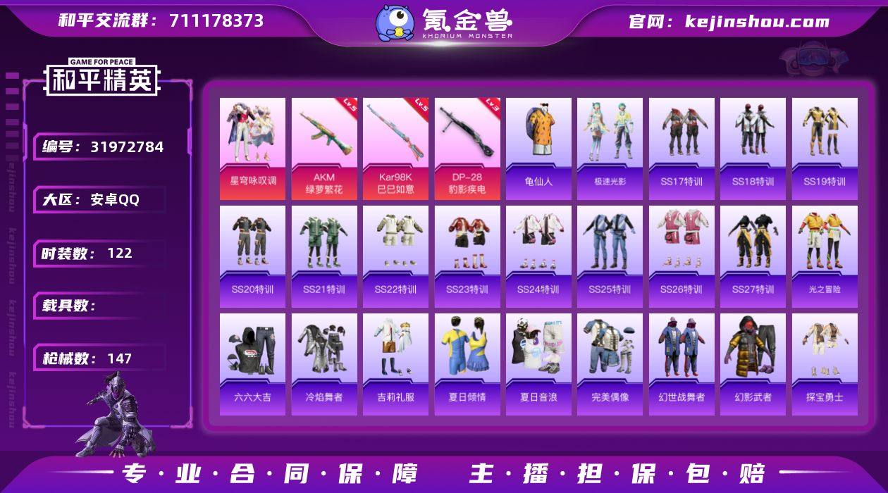 安卓 手Q-1粉装-5特效枪-0载具-2粉色飞行器-41384热力值-13王牌印记-122套装-147枪皮 【热门品类】:套装-龟仙人 【粉色套装】:粉装-星穹咏叹调 【粉色枪皮等级】:AKM-绿萝繁花(五级),ACE32-萌骑漫游(二级),Kar98K-巳巳如意(五级),Mk14-福马献瑞(三级),DP-28-豹影疾电(三级) 【粉色枪皮】:AKM-绿萝繁花,ACE32-萌骑漫游,Kar98K-巳巳如意,Mk14-福马献瑞,DP-28-豹影疾电 【粉色飞行器】:炫彩糖果飞行器,极意拳锋飞行器 【粉色降落伞】:第五大道降落伞,莲影清波降落伞,沙丘之主降落伞,炫彩糖果降落伞 【稀有套装】:套装-龟仙人,套装-雪国风尚,套装-炫彩糖果,套装-马上有钱,套装-极速光影,角色-月烬之祷,套装-雨过天青,套装-红釉青花,角色-暖阳柴柴 【稀有枪皮】:AUG-冰晶雪宝,AKM-彩虹符号,AKM-海渊国主,AKM-灼热熔岩,AKM-缤纷海域,AKM-虎虎生威,AKM-霓虹街区,AKM-龙的传人,M16A4-幻世战舞者,SCAR-L-是爱神辣,SCAR-L-炫彩节奏,SCAR-L-玉兔迎春,SCAR-L-粉锦千层,SCAR-L-红色方程式,M416-糯团青竹,M416-红色方程式,M416-绯红前夜,M416-蓝色火焰,GROZA-懵萌河马,GROZA-荧海星豚,AUG-天降萌叽,AUG-耀粉歌者,M762-天降萌叽,M762-瑞龙福将,M762-第五大道,M762-幻影飞狐,Mk47-妙红点点,G36C-懵萌河马,AC-VAL-快闪甜心,蜜獾-天降萌叽,UZI-啾咪啾咪,UZI-天降萌叽,UZI-红色方程式,UMP45-蓝色火焰,Vector-焰鹰斗篷,Vector-彩虹符号,Vector-生命誓言,汤姆逊-天降萌叽,汤姆逊-耀粉歌者,P90-快闪甜心,P90-巳巳如意,Kar98K-炫彩节奏,Kar98K-红色方程式,M24-炫彩节奏,AWM-焰鹰斗篷,AWM-音爆索尼克,SKS-炫彩节奏,SKS-糯团青竹,VSS-星之彼岸,VSS-荒野猎神,Mini14-耀粉歌者,Win94-瑞龙福将,SLR-彩虹符号,莫辛纳甘-懵萌河马,AMR-妙红点点,M417-惊鸿侠...
