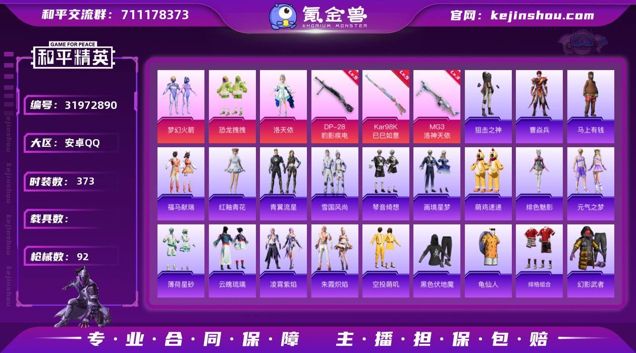 实名:可二次实名 是否支持人脸包赔:支持 粉装数量:3 特效枪数量:3 时装数:373 枪械数:92 恐龙拽拽,洛天依,梦幻火箭 五级DP-28-豹影疾电,五级Kar98K-巳巳如意,三级MG3-洛神天依 狙击之神,曹焱兵,马上有钱,福马献瑞,红釉青花,雨过天青,青翼流星,雪国风尚,画境星梦,琴音绮想,绯色魅影,萌鸡速递,元气之梦,薄荷星砂,云魄琉璃,凌霄紫焰,朱霞炽焰,缤纷果语,白糯汤圆,白色伏地魔,彩虹兔,长空猛禽,潮流炫酷,大橘大利,都市魅力,电音精灵,绯格组合,龟仙人,湖蓝色名流,荷畔雨呱,黑色伏地魔,黄色伏地魔,黄色名流,黄色运动,红色运动,幻世战舞者,幻羽潜行,幻影武者,酒红色名流,橘黑制服,竞技达人朋克,竞技名士,极速红龙,街头潮人,街头风暴,空投萌叽,蓝彩潮人,灵公主,猎鹰,蓝色运动,冷焰舞者,漫步者,猛禽,魅力单车,麻辣教官,萌趣绒叽,破蛋小黄鸡,破晓战魂,情公主,绮丽涂鸦,青年教官,云朵鹅,人气偶像,深蓝色名流,SS18特训,SS19特训,SS20特训,SS27特训,时希公主,天籁歌者,特训学院,特种颜团子,完美偶像,炫蓝之夏,雪绒豹,夏日音浪,耀粉歌者,鹰眼刺客,焰鹰斗篷,战地督导,灼焰舞者 炫彩糖果降落伞,异瞳寒姬降落伞,精灵梦叶罗丽降落伞,洛神天依降落伞,梦幻火箭降落伞,墨龙九天降落伞,星穹咏叹调降落伞 卖家说:三套粉装,有洛天依全套,火箭少女差两个 有火箭少女,4个升级枪