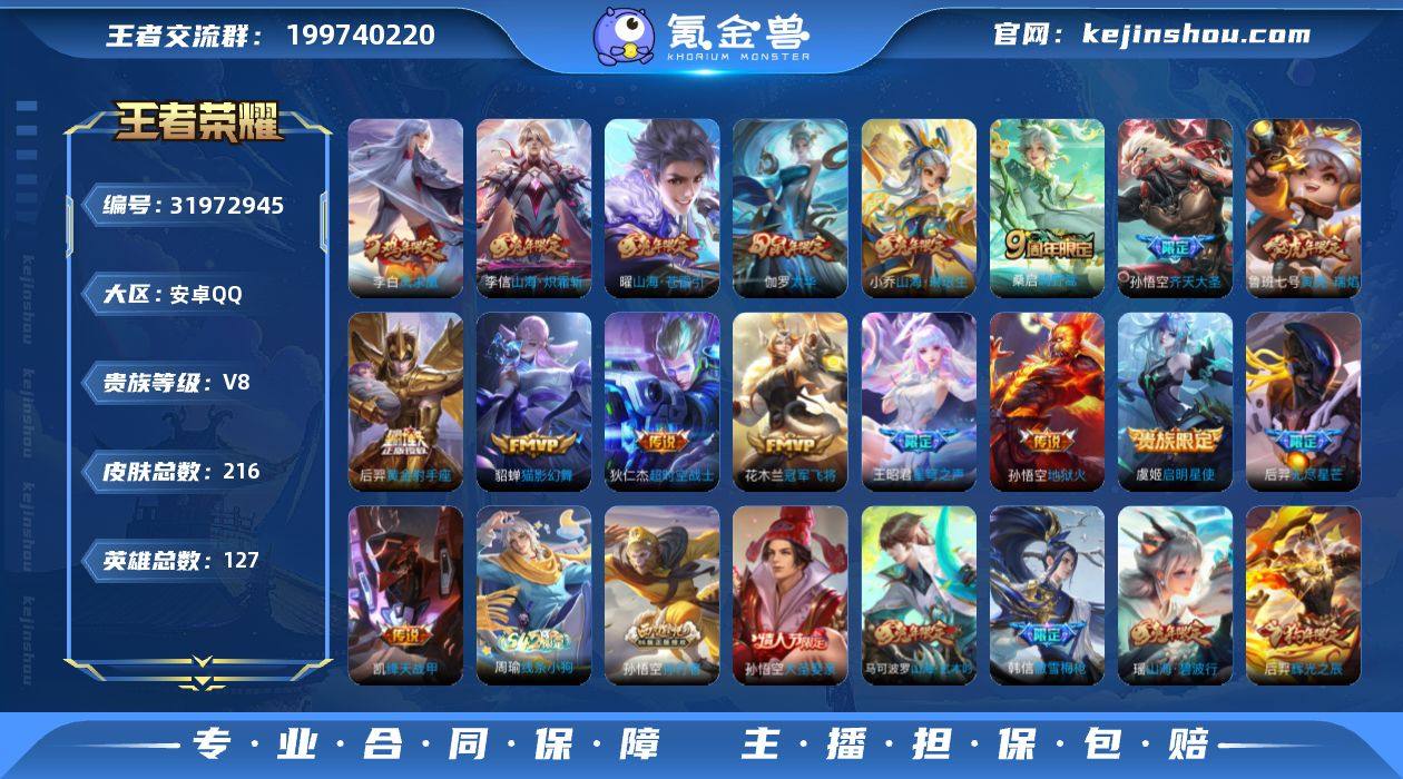 安卓Q-V8-至尊星耀V段位-127英雄-216皮肤-17传说-43史诗 【传说皮肤】:桑启鸣野蒿,孙悟空齐天大圣,小乔山海琳琅生,曜山海苍雷引,李信山海炽霜斩,王昭君星穹之声,后羿无尽星芒,鲁班七号寅虎瑞焰,铠绛天战甲,虞姬启明星使,伽罗太华,貂蝉猫影幻舞,花木兰冠军飞将,后羿黄金射手座,李白凤求凰,孙悟空地狱火,狄仁杰超时空战士 【限定皮肤】:白起狰,狄仁杰阴阳师,小乔山海琳琅生,赵云皇家上将,孙尚香蔷薇恋人,鲁班七号乒乒小将,鲁班七号寅虎瑞焰,钟无艳超时空战士,芈月重明,夏侯惇朔风刀,甄姬落雪兰心,曹操烛龙,典韦穷奇,马可波罗山海玄木吟,狄仁杰魔术师,狄仁杰万华元夜,达摩沙漠行僧,项羽海滩派对,老夫子醍醐杖,程咬金演武夺筹,韩信逐梦之影,韩信傲雪梅枪,王昭君星穹之声,兰陵王金庭之子,孙悟空大圣娶亲,孙悟空孙行者,孙悟空齐天大圣,牛魔御旌,后羿辉光之辰,后羿如梦令,后羿无尽星芒,李元芳云中旅人,虞姬启明星使,钟馗驱傩正仪,蔡文姬繁星吟游,太乙真人饕餮,鬼谷子原初探秘者,鬼谷子五谷丰年,苏烈千军破阵,弈星混沌棋,沈梦溪大漠名商,明世隐疑决卦,狂铁御狮,米莱狄御霄,瑶山海碧波行,李信山海炽霜斩,伽罗太华,伽罗天狼溯光者,盾山御銮,嫦娥如梦令,嫦娥拒霜思,嫦娥暖冬兔眠,曜山海苍雷引,鲁班大师探海日志,桑启海盐诗旅,暃星界游侠,张良古海寻踪,鬼谷子天穹祈灯 【年限皮肤】:李白凤求凰,后羿辉光之辰,伽罗太华,鲁班七号寅虎瑞焰,小乔山海琳琅生,曜山海苍雷引,李信山海炽霜斩,瑶山海碧波行,马可波罗山海玄木吟 【赛季限定】:白起狰,太乙真人饕餮,曹操烛龙,芈月重明,典韦穷奇,狂铁御狮,米莱狄御霄,牛魔御旌,盾山御銮,夏侯惇朔风刀,弈星混沌棋,明世隐疑决卦,老夫子醍醐杖,鬼谷子原初探秘者,狄仁杰万华元夜,程咬金演...