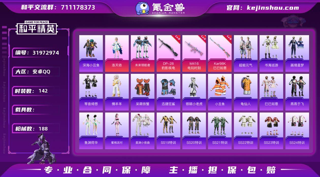 安卓 手Q-2粉装-7特效枪-0载具-3粉色飞行器-53092热力值-17王牌印记-142套装-188枪皮 【热门品类】:套装-深海小丑鱼,套装-小丑鱼,套装-龟仙人 【粉色套装】:角色-洛天依,粉装-未来领航者 【粉色枪皮等级】:M416-电玩时刻(五级),UMP45-萌骑冒险(四级),Kar98K-巳巳如意(五级),Mk14-福马献瑞(五级),AA12-G-萌骑幻想(二级),DP-28-豹影疾电(五级),信号枪-金乌曜日(二级) 【粉色枪皮】:M416-电玩时刻,UMP45-萌骑冒险,Kar98K-巳巳如意,Mk14-福马献瑞,AA12-G-萌骑幻想,DP-28-豹影疾电,信号枪-金乌曜日 【粉色飞行器】:炫彩糖果飞行器,星空武士飞行器,彩虹独角兽飞行器 【粉色降落伞】:绝对恒星降落伞,百万伏特降落伞,春暖花开降落伞,风花雪月降落伞,纯梦嫁纱降落伞,超新星降落伞,千金淑猫降落伞,月影灵韵降落伞,幻彩电音降落伞,极意拳锋降落伞,炫彩糖果降落伞 【稀有套装】:套装-龟仙人,套装-巳巳如意,套装-超能元气,套装-雪国风尚,套装-炫彩糖果,套装-马上有钱,套装-燕燕于飞,套装-鱼渊荷华,角色-蜜桃派对,套装-星渊小夜曲,玩偶服-懒羊羊,套装-书海巡游,套装-画境星梦,套装-琴音绮想,套装-雨过天青,套装-红釉青花 【稀有枪皮】:AUG-冰晶雪宝,AKM-彩虹符号,AKM-影袭,AKM-灼热熔岩,AKM-破晓战魂,AKM-胡桃卫兵,AKM-龙的传人,M16A4-幻世战舞者,M16A4-甜心亚梦,M16A4-红色方程式,M16A4-蓝色火焰,SCAR-L-夜灯,SCAR-L-炫彩节奏,SCAR-L-玉兔迎春,SCAR-L-红色方程式,M416-糯团青竹,M416-红色方程式,M416-绿野极光,M416-蓝色火焰,GROZA-彩虹符号,GROZA-田园牧歌,AUG-天降萌叽,AUG-甜蜜菠萝,AUG-耀粉歌者,QBZ-彩虹符号,QBZ-银碳小老虎,M762-天降萌叽,M762-彩虹符号,G36C-青丘仙客,AC-VAL-天降萌叽,AC-VAL-甜心亚梦,AC-VAL-闲梦青缨,AC-VAL-时光...