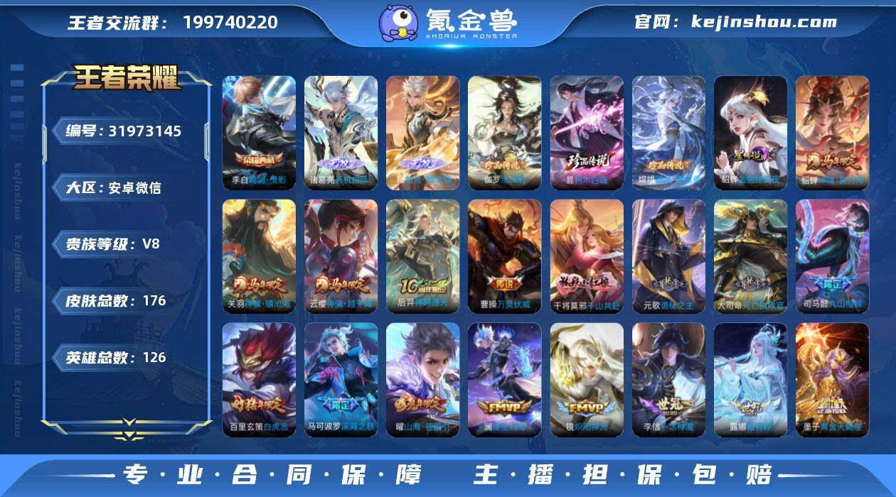 安卓WX-V8-最强王者段位-126英雄-176皮肤-1典藏皮肤-2无双-3珍品传说-26传说-69限定-8印记-20按键 【荣耀典藏】:李白鸣剑曳影 【无双皮肤】:诸葛亮天机白泽,曜器灵螭龙剑 【珍品传说】:伽罗沧流箭,暃朽木白哉,嫦娥器灵落星盏 【传说皮肤】:韩信踏浪归,云缨神骥越千峰,关羽神骥镇沧海,貂蝉神骥聚万邦,后羿神树通天,曹操万灵伏威,干将莫邪千山共赴,元歌诡秘之主,大司命死亡执政官,司马懿九山相柳,墨子黄金天蝎座,澜逐花归海,露娜霜月吟,宫本武藏惊梅引,东皇太一灼幽烈阳,曜山海苍雷引,李白诗剑行,马可波罗深海之息,镜炽阳神光,虞姬启明星使,曜云鹰飞将,李信一念神魔,刘备时之恋人,张良黄金白羊座,百里玄策白虎志,后羿黄金射手座 【限定皮肤】:狄仁杰阴阳师,赵云皇家上将,元歌云间偶戏,典韦岱宗,马可波罗深海之息,马可波罗山海玄木吟,狄仁杰魔术师,项羽海滩派对,韩信傲雪梅枪,孙悟空至尊宝,虞姬启明星使,百里玄策白虎志,梦奇顽趣,裴擒虎李小龙,裴擒虎擒涛扼浪,曜山海苍雷引,鲁班大师探海日志,桑启海盐诗旅,艾琳流音漫舞,司空震地狱燃心,阿古朵江河有灵,张良古海寻踪,蒙犽百解令,蒙恬荣光圣徽,高渐离燃音魔法,妲己灵卜魔法,鬼谷子天穹祈灯,沈梦溪龙舞盛年,李元芳蔬乡物语,刘邦剑破天穹,上官婉儿群星魔术团,程咬金群星魔术团 【年限皮肤】:百里玄策白虎志,典韦岱宗,曜山海苍雷引,马可波罗山海玄木吟 【赛季限定】:桑启海盐诗旅,裴擒虎擒涛扼浪,鲁班大师探海日志,张良古海寻踪,鬼谷子天穹祈灯,刘邦剑破天穹,钟馗虚灵犬护,甄姬逆浪荇歌,亚瑟荣光之誓,梦奇顽趣,蒙恬荣光圣徽,项羽九幽镇关 【战令限定】:元歌云间偶戏,司空震地狱燃心,艾琳流音漫舞,高渐离燃音魔法,妲己灵卜魔法,李元芳蔬乡物语,刘禅鸭鸭历险记,沈梦溪鸭鸭历险记...