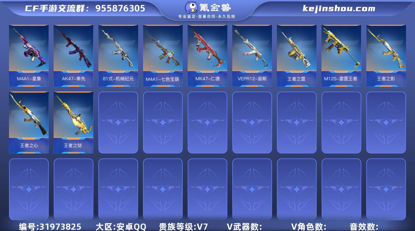 安卓Q☝可修改二次实名☝贵族7☝AK47-奉先☝M4A1-星象☝81式-机械纪元☝MK47-仁德☝VEPR12-宙斯☝M4A1-七色宝葫-黑曜☝王者之心☝王者之影☝M200-幻神☝王者之霆☝KSG-孟获☝M12S-雷霆王者☝COP357-堕天神☝CP357-飞龙在天☝王者之狱☝详细见图