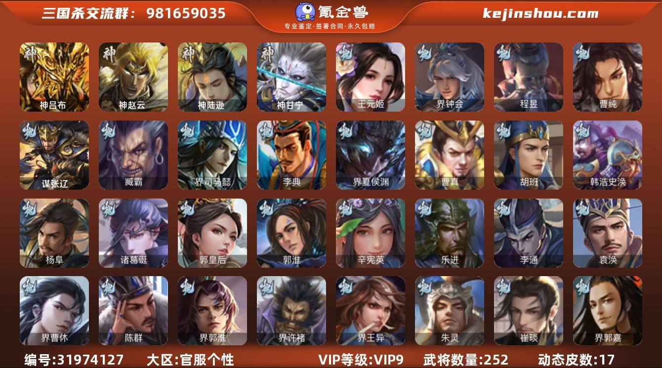 官阶:骠骑将军;VIP等级:VIP9;史诗武将数量:19;动态皮肤数量:17;武将总数:252;史诗宝珠数量:9;将魂数量:5557;神将:4;魏国史诗武将:6;蜀国史诗武将:0;吴国史诗武将:3;群史诗武将:9