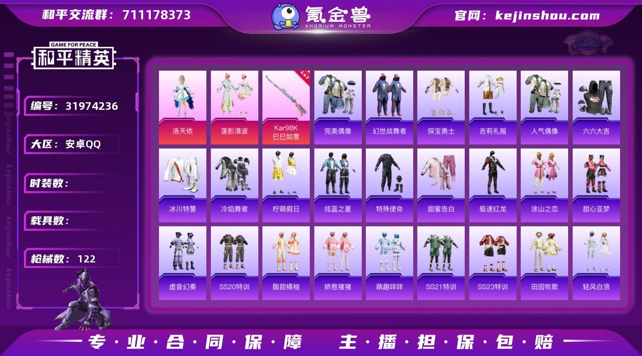 CH222+【女号-洛天依-2粉装-3特效枪-美羊羊-2角色-48点地铁满天赋-2太阳Q可二次】安卓Q区-2粉装-3特效枪-39623热力值-6王牌印记-87套装-122枪皮【优质套装】: 洛天依 莲影清波【特效枪等级】:Kar98K-巳巳如意(五级- Kar98K-巳巳如意)【优质武器皮肤】: Kar98K-巳巳如意【稀有武器皮肤】: DBS-乌木金纹 SCAR-L-海盐豹豹 GROZA-海盐豹豹 Kar98K-巳巳如意 Mk14-冰河战士 UZI-冰河战士 M16A4-冰河战士 20-H-乌木金纹 PKM-啾咪啾咪 M416-夜灯 M416-糯团青竹 M416-暗夜行者 AKM-彩虹符号 SCAR-L-玉兔迎春 SCAR-L-炫彩节奏 SCAR-L-粉锦千层 M16A4-幻世战舞者 M16A4-甜心亚梦 M16A4-莲影清波 GROZA-田园牧歌 GROZA-懵萌河马 AUG-天降萌叽 M762-天降萌叽 Mk47-乌木金纹 Mk47-妙红点点 Mk47-洛神天依 G36C-乌木金纹 G36C-懵萌河马 AC-VAL-天降萌叽 AC-VAL-快闪甜心 AC-VAL-甜心亚梦 AC-VAL-乌木金纹 蜜獾-天降萌叽 蜜獾-娇憨猪猪 Kar98K-王子的夏天 Kar98K-炫彩节奏 M24-乌木金纹 M24-炫彩节奏 AWM-天降萌叽 莫辛纳甘-乌木金纹 20-H-莲影清波 UZI-娇憨猪猪 UZI-天降萌叽 UMP45-涂山之恋 UMP45-夜灯 Vector-生命誓言 Vector-田园牧歌 野牛-乌木金纹 MP5K-乌木金纹 P90-乌木金纹 P90-快闪甜心 P90-玩趣呆呆 S686-奇异狩猎者 S12K-幻世战舞者 S12K-是爱神辣 S12K-娇憨猪猪 DBS-甜心亚梦 DBS-彩虹符号 DBS-圣堂之誓 SPAS-12-田园牧歌 M249-彩虹符号 【其他套装】: 洛天依 莲影清波 龟仙人 龙魂突击队 狂花道·娜可露露 白糯汤圆 街头风暴 冰河战士 SS30特训 战术大师 巳巳如意 SS28特训 SS29特训 贝斯之夜 银河圣歌 蝶吟
