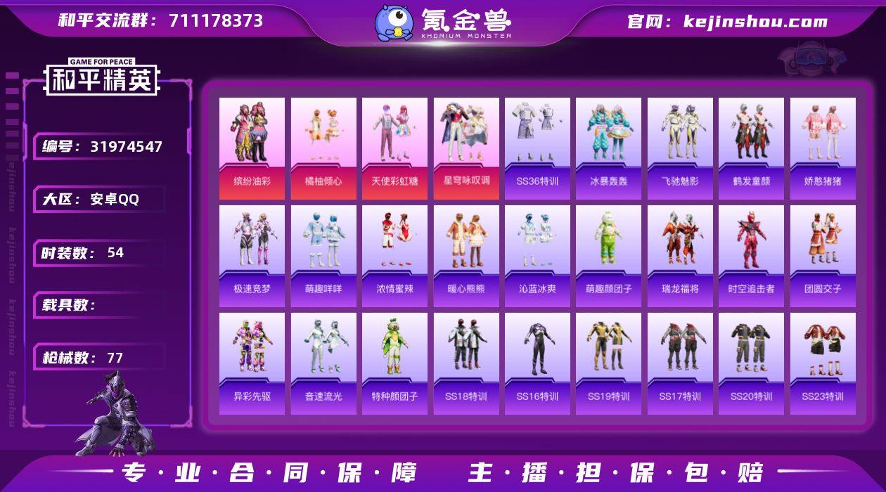 【ky250】安卓 手Q-4粉装-4特效枪-0载具-3粉色飞行器-53288热力值-5王牌印记-158套装-183枪皮 【热门品类】:套装-小丑鱼,套装-龟仙人,套装-粉红小猪 【粉色套装】:粉装-酣梦娃娃,粉装-仲夏莫吉托,玩偶服-猪猪侠,角色-千金淑猫 【粉色枪皮等级】:Kar98K-巳巳如意(五级),M417-第五大道(四级),DP-28-豹影疾电(五级) 【粉色枪皮】:Kar98K-巳巳如意,Mk14-福马献瑞,M417-第五大道,DP-28-豹影疾电 【粉色飞行器】:炫彩糖果飞行器,星夜魔法师飞行翼,冰川粉黛飞行器 【粉色降落伞】:花间之火降落伞,垂柳戏鸭降落伞,暗夜鎏金降落伞,畅跳缤纷降落伞,飒粉甜心降落伞,炫光之旅降落伞,圣堂之誓降落伞,临安公主降落伞,星穹咏叹调降落伞,幻彩电音降落伞,时光之吻降落伞,炫彩糖果降落伞 【稀有套装】:套装-龟仙人,套装-绒宝小鹅,套装-巳巳如意,套装-雪国风尚,套装-炫彩糖果,套装-燕燕于飞,套装-鱼渊荷华,套装-紫幽梦,套装-蓝冰羽,套装-彩虹兔,套装-云朵鹅,套装-雪绒豹,角色-时希公主,套装-朱霞炽焰,套装-凌霄紫焰,角色-绯色魅影 【稀有枪皮】:AKM-彩虹符号,AKM-春暖花开,AKM-灼热熔岩,AKM-破晓战魂,AKM-缤纷海域,AKM-龙的传人,M16A4-幻世战舞者,M16A4-红色方程式,M16A4-蓝色火焰,SCAR-L-炫彩节奏,SCAR-L-玉兔迎春,SCAR-L-粉锦千层,SCAR-L-红色方程式,SCAR-L-小狗蛇点点,M416-糯团青竹,M416-红色方程式,M416-蓝色火焰,GROZA-懵萌河马,GROZA-田园牧歌,AUG-天降萌叽,AUG-甜蜜菠萝,AUG-耀粉歌者,QBZ-彩虹符号,M762-天降萌叽,M762-暗夜鎏金,M762-甜心宝贝,M762-第五大道,M762-云朵鹅,Mk47-妙红点点,Mk47-炫光之旅,G36C-懵萌河马,AC-VAL-天降萌叽,AC-VAL-快闪甜心,蜜獾-天降萌叽,蜜獾-娇憨猪猪,ARX-凌霄紫焰,UZI-啾咪啾咪,UZI-娇憨猪猪,UZI-红色方...