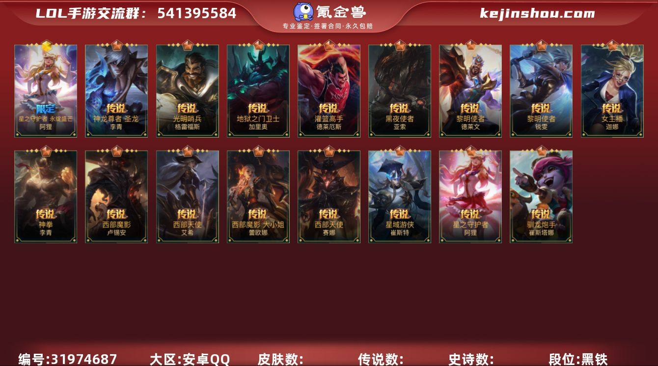 [17276041]2神话 17传说 48史诗 108皮肤 可二次 可修改实名 【段位】翡翠 【神话皮】星之守护者阿狸永绽盛芒,夜星流火 金克丝 【传说皮】驯龙炮手,光明哨兵格雷福斯,地狱之门卫士,星之守护者阿狸,西部天使赛娜,西部魔影大小姐蕾欧娜,星域游侠卡牌,西部天使寒冰,源计划:净化,女主播风女,黑夜使者亚索,灌篮高手,神龙尊者 圣龙 李青,神拳盲僧,西部魔影卢锡安,黎明使者德莱文,黎明使者锐雯
