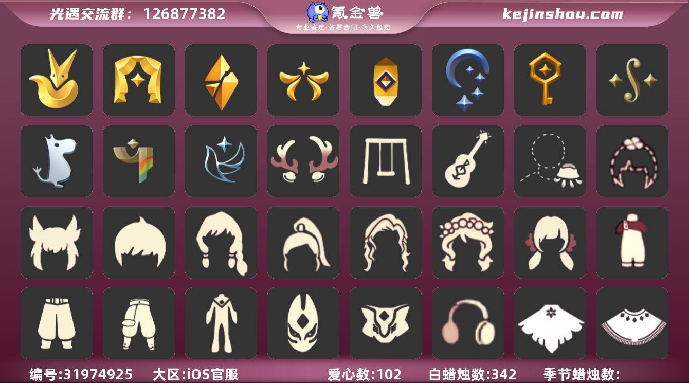 iOS官服 手机账号 2珍稀物品 12毕业季 5毕业图 28蜡烛 【珍稀物品】白枭(帝企鹅发),彩虹围巾(五塑彩带斗) 【季节已毕业】青鸟季,潜海季,表演季,追忆季,夜行季,拾光季,归巢季,九色鹿(九色鹿季),筑巢季,二重奏季,姆明季,彩染季 【完成地图】晨岛,雨林,霞谷,墓土(暮土),禁阁 【礼包】兔子鞋(兔子拖鞋),雪人鞋(圣诞雪人靴),运动鞋(跃动跑鞋),新年裤(瑞气服饰),暗彩装扮(彩虹武士裤),蝴蝶结(大蝴蝶结),水母(水母肩饰),姆明饰品套装(姆明尾巴),向日葵套(夏日有友礼包),南瓜(冥龙南瓜),巫师(巫师帽),橘子(大橘大利),奥利奥(周年庆抱枕),兔子(玉兔头饰)(玉兔发饰)(兔子发饰),四叶草(四叶草头饰),星月头饰(星月头冠),九色鹿角(神鹿祝福头饰)(神鹿祝福礼包),新年耳钉(金鳞耳饰),彩虹耳钉(彩虹耳饰),彩虹耳机,日光耳环,枯角(巫树犄角),鹿角(圣诞鹿角),福娃(福娃礼包)(春之日礼包)(铜钱斗),蝙蝠套(蝙蝠斗篷)(南瓜头),吉他(音韵吉他)(白吉他),红伞(瑞气纸伞),献瑞折扇礼包,茶壶(小憩茶桌),猫背饰(猫咪背饰),滑板(冲浪滑板)(冲浪板),大铁头 【裤子】筑巢季·裤子(设计师长袍),妮妮裙子(妮妮长裙),王子服(小王子套装),武士裤,背带裤,搓澡巾 【面具】夜行毕业面具(棕熊面具),呼吸面具(潜水面具),黄眉企鹅面具,辉光羚羊面具 【面饰】黑框眼镜(粗框眼镜),青鸟毕业面饰(青鸟面饰),红耳机 【项链】围巾(肩带) 【发型】小王子发型,单侧绑发(单边小辫),飞天盘发(九色鹿丸子头),留辫蘑菇头,虚荣,归巢毕业发型(五塑彩羽发),若笠(箬笠) 【头饰】平顶帽,蓝色音乐会(蓝色音乐符),牛仔帽(西部帽) 【斗篷】燕尾斗篷,领主红斗篷(暗红斗篷),遥鲲斗篷(双翼遥鲲斗),粉红绒毛斗篷(绒毛斗篷),青鸟毕业斗篷(青鸟斗篷),彩染围巾斗篷,绿芽 【配饰】鲲灯(追忆之书),相机(季卡相机),小红伞(姆明红伞)(姆明大伞),姆明抱枕,雨伞,筑巢季·小手办(光之子试衣),高...