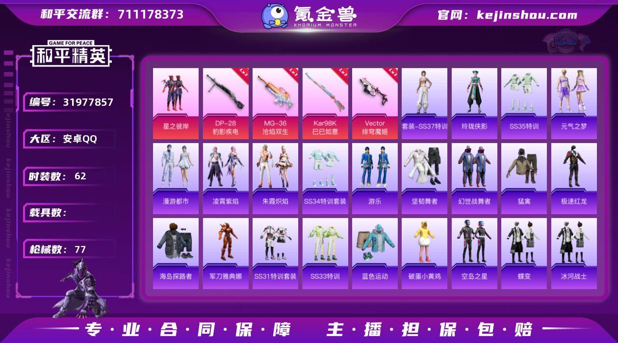 可二次实名【深海小丑鱼5特效枪1粉装 秒换绑不用等】 安卓Q区-20834热力值-1印记-62套装-77枪皮 【1粉装】 星之彼岸【5特效枪】 Mk14-福马献瑞(4级) Kar98K-巳巳如意(4级) Vector-绯穹魔姬(4级) DP-28-豹影疾电(5级) MG-36-沧焰双生(4级)【80热门】 破蛋小黄鸡 深海小丑鱼 军刀雅典娜 极速红龙 SS27特训 SS26特训 SS25特训 SS24特训 M762-天降萌叽 M762-彩虹符号 UMP45-蓝色火焰 M249-彩虹符号 MG3-幻世战舞者 M416-蓝色火焰 长空猛禽 霓虹街区 魅力单车 蓝色运动 坚韧舞者 黄色运动 黄色伏地魔 黑色伏地魔 海岛探路者 汤姆逊-智耀战神 创世·幻影 海琴烟 玲珑侠影 冰河战士 GROZA-福马献瑞 SS34特训 漫游都市 朱霞炽焰 AWM-天降萌叽 大橘大利 凌霄紫焰 大砍刀-鬼刀 SS28特训 海盐绵绵冰 SS31特训 SS33特训 巳巳如意 游乐 老实芭蕉 Famas-突变脉冲 Vector-突变脉冲 智谋强哥 战术大师 JS9-凌霄紫焰 MG-36-凌霄紫焰 蜜獾-启元战纹 马上有钱 ARX-凌霄紫焰 P92-凌霄紫焰 平底锅-凌霄紫焰 狙击之神 M416-糯团青竹 Mk14-薄荷星砂 风玲 AMR-鸡智如我 Mk14-冰河战士 破片手榴弹-巳巳如意 AKM-涂鸦街区 S686-千金淑猫 AKS-74U-鸡智如我 UZI-冰河战士 SS35特训 蝶变 元气之梦 糖霜甜心 VSS-香桃花海 十字弩-异域银装 破片手榴弹-拽到爆炸 十字弩-异瞳寒姬 P90-玩趣呆呆 平底锅-空岛之星 P90-巳巳如意 S686-巳巳如意 SCAR-L-海盐豹豹 SS37特训 破片手榴弹-呆爆全场【12背包】 海盐豹豹背包(3级) 冰河战士背包(3级) 破晓战魂背包(3级) 蝶变背包(3级) 智谋强哥背包(3级) 智耀战神背包(3级) 凌霄紫焰背包(3级) 薄荷星砂背包(3级) 炫彩糖果背包(3级) 狂鲨锋刃背包(3级) 霓虹街区背包(3级) 龙的传人背包(3级) 营地ID:950684104