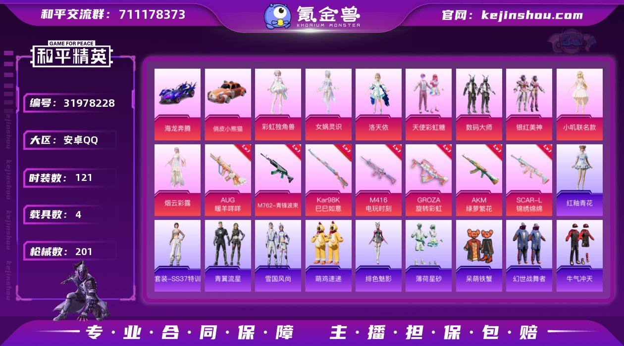 苹果 手Q-无敌战神框-5粉装-9特效枪-1载具-1粉色飞行器-69123热力值-17王牌印记-163套装-229枪皮 【热门品类】:粉装-梦幻火箭,套装-浪漫天命,套装-小丑鱼,角色-军刀雅典娜,套装-金羽特工,套装-忍者信条,套装-AG战队服,套装-龟仙人,套装-潮萌小黄鸭 【粉色套装】:粉装-幻影战神,粉装-梦幻火箭,粉装-蓝莓炮弹,角色-绝色倾城,角色-羲和光序 【粉色枪皮等级】:AKM-绿萝繁花(五级),SCAR-L-锦绣绵绵(五级),M416-五爪金龙(七级),GROZA-镜光银凌(五级),M762-电糖天使(四级),ACE32-萌骑漫游(一级),AKS-74U-森灵之息(五级),Kar98K-巳巳如意(五级),Mk14-福马献瑞(一级) 【粉色载具】:仰望U7(阿盖尔紫) 【粉色枪皮】:AKM-绿萝繁花,SCAR-L-锦绣绵绵,M416-五爪金龙,GROZA-镜光银凌,M762-电糖天使,ACE32-萌骑漫游,AKS-74U-森灵之息,Kar98K-巳巳如意,Mk14-福马献瑞 【粉色飞行器】:绝色倾城飞行器 【粉色降落伞】:梦幻火箭降落伞,星之彼岸降落伞,辉云木星降落伞 【稀有套装】:套装-龟仙人,套装-暖暖麦兜,套装-马上有钱,套装-火种守卫者,套装-燕燕于飞,套装-鱼渊荷华,套装-画境星梦,套装-琴音绮想,套装-雨过天青,套装-红釉青花 【稀有枪皮】:AKM-夜灯,AKM-彩虹符号,AKM-江南烟雨,AKM-生命誓言,AKM-破晓战魂,AKM-萌趣颜团子,AKM-虎虎生威,AKM-霓虹街区,AKM-龙的传人,M16A4-幻世战舞者,M16A4-甜心亚梦,M16A4-红色方程式,M16A4-千金淑猫,SCAR-L-炫彩节奏,SCAR-L-玉兔迎春,SCAR-L-红色方程式,M416-夜灯,M416-暗夜行者,M416-糯团青竹,M416-绯红前夜,M416-蓝色火焰,GROZA-异彩先驱,GROZA-彩虹符号,GROZA-影袭,GROZA-治愈之星,GROZA-田园牧歌,AUG-辉耀战甲,AUG-怪笑疯兔,AUG-甜蜜菠萝,AUG-耀粉歌者,M762-天降萌叽,M762-彩虹符号,M762-牛气冲天,M762-...