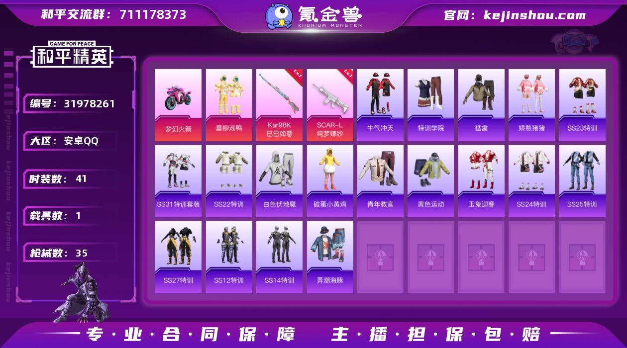 可二次实名【SCAR-L纯梦嫁纱1载具2特效枪1粉装 秒换绑不用等】 安卓Q区-13802热力值-1印记-41套装-35枪皮 【1载具】 双人摩托梦幻火箭【1粉装】 垂柳戏鸭【2特效枪】 SCAR-L-纯梦嫁纱(2级) Kar98K-巳巳如意(2级)【30热门】 破蛋小黄鸡 白色伏地魔 SS27特训 SS25特训 SS24特训 SS23特训 SS22特训 Mini14-梦幻火箭 SCAR-L-玉兔迎春 M762-天降萌叽 Mk47-乌木金纹 UZI-娇憨猪猪 S12K-垂柳戏鸭 DBS-彩虹符号 M416-蓝色火焰 长空猛禽 弄潮海豚 特训学院 青年教官 牛气冲天 黄色运动 SS14特训 SS21特训 SS31特训 战术大师 狙击之神 Kar98K-彩虹符号 MG3-乌木金纹 平底锅-娇憨猪猪 十字弩-异域银装【1飞行器】 火焰蝠人飞行服【6背包】 摩登王国背包(3级) 巳巳如意背包(3级) 垂柳戏鸭背包(3级) 梦幻火箭背包(3级) 龟仙人龟壳背包(3级) 龙的传人背包(3级) 营地ID:968375963