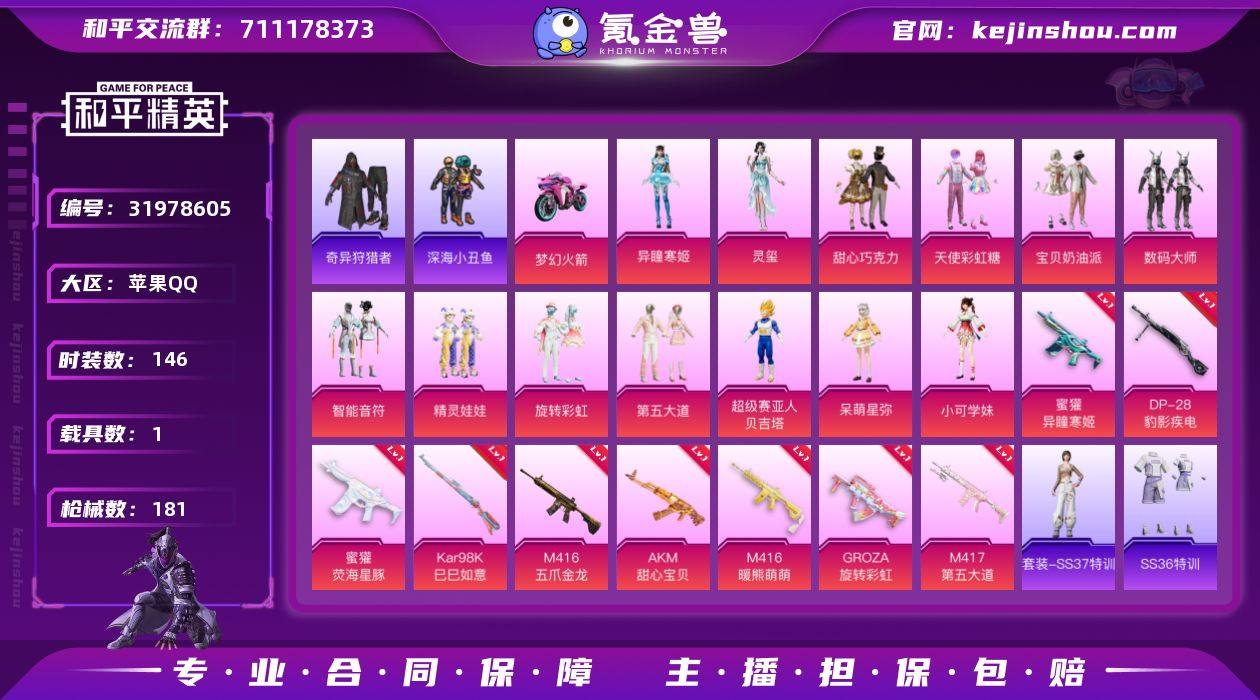 【ky434】安卓 手Q-9粉装-16特效枪-2载具-5粉色飞行器-80059热力值-11王牌印记-156套装-251枪皮 【热门品类】:粉装-梦幻火箭,粉装-缤纷油彩,套装-龟仙人 【粉色套装】:粉装-宝贝奶油派,粉装-梦幻火箭,粉装-缤纷油彩,粉装-天星战神,粉装-未来歌姬,粉装-炫光之旅,粉装-蜜语绒猫,粉装-幻彩电音,角色-虎痴许褚 【粉色枪皮等级】:AKM-绿萝繁花(五级),SCAR-L-梦幻火箭(四级),SCAR-L-锦绣绵绵(五级),M416-心之恋语(七级),GROZA-镜光银凌(五级),AUG-暖羊咩咩(五级),AKS-74U-森灵之息(四级),Kar98K-未来歌姬(四级),Kar98K-巳巳如意(五级),AMR-炫光之旅(四级),MK12-雪月幻音(四级),DP-28-豹影疾电(五级),PKM-天星战神(四级),MG-36-幻彩电音(四级) 【粉色载具】:永恒黄蜂,双人摩托-梦幻火箭 【粉色枪皮】:AKM-绿萝繁花,SCAR-L-梦幻火箭,SCAR-L-锦绣绵绵,M416-心之恋语,GROZA-镜光银凌,AUG-暖羊咩咩,UMP45-萌骑冒险,AKS-74U-森灵之息,Kar98K-未来歌姬,Kar98K-巳巳如意,Mk14-福马献瑞,AMR-炫光之旅,MK12-雪月幻音,DP-28-豹影疾电,PKM-天星战神,MG-36-幻彩电音 【粉色飞行器】:炫彩糖果飞行器,梦幻火箭飞行器,镜光幻境飞行翼,夜幕颂歌飞行器 【粉色降落伞】:甜心宝贝降落伞,梦幻火箭降落伞,心之恋语降落伞,天星战神降落伞,未来歌姬降落伞,炫光之旅降落伞,莲影清波降落伞,圣堂之誓降落伞,沙丘之主降落伞,蜜语绒猫降落伞,江南烟雨降落伞,星梦奇缘降落伞,雪月幻音降落伞,幻彩电音降落伞,极意拳锋降落伞,炫彩糖果降落伞 【稀有套装】:套装-龟仙人,套装-雪国风尚,套装-炫彩糖果,套装-马上有钱,套装-燕燕于飞,套装-鱼渊荷华,套装-粉恋花,套装-紫幽梦,套装-蓝冰羽,套装-星影赞美诗,套装-云朵鹅,套装-雪绒豹,套装-朱霞炽焰,套装-凌霄紫焰,角色-紫俏灵猫...