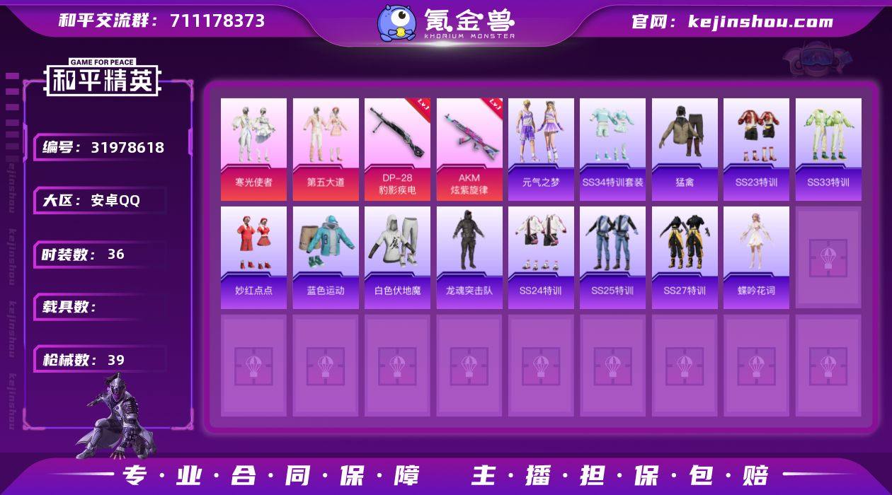 【满级AKM炫紫旋律2粉装2特效枪 秒换绑不用等】 安卓Q区-13666热力值-4印记-36套装-39枪皮 【2粉装】 寒光使者 第五大道【2特效枪】 AKM-炫紫旋律(7级) DP-28-豹影疾电(5级)【30热门】 白色伏地魔 SS27特训 SS25特训 SS24特训 SS23特训 M762-天降萌叽 长空猛禽 妙红点点 蓝色运动 蝶吟花词 SS34特训 TMP-9-江南烟雨 龙魂突击队 海盐绵绵冰 SS33特训 平底锅-梦幻舞会 战术大师 狙击之神 M416-糯团青竹 M417-玩趣呆呆 Mk14-薄荷星砂 M249-妙红点点 AKS-74U-鸡智如我 烟雾弹-冰氧夏日 DBS-荧海星豚 薄荷星砂 元气之梦 AUG-异域银装 平底锅-炫紫旋律 平底锅-妙红点点【1飞行器】 UMP45-涂山之恋【6背包】 银碳小老虎背包(3级) 天降萌叽背包(3级) 第五大道背包(3级) 音爆索尼克背包(3级) 薄荷星砂背包(3级) 龟仙人龟壳背包(3级) 营地ID:944134118