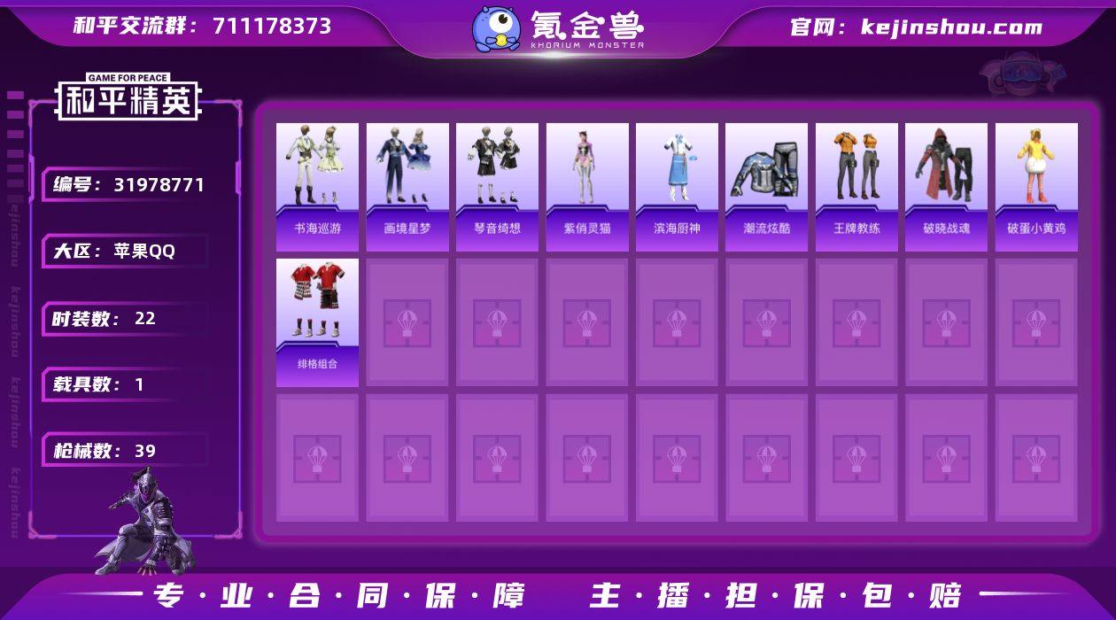 苹果 手Q-1神装-0粉装-0特效枪-1载具-2粉色飞行器-12881热力值-1王牌印记-22套装-39枪皮 【红色神装等级】:暮色玫影-艾丽娅(二级) 【红色角色神装】:暮色玫影-艾丽娅 【粉色载具】:暮色幽蹄 【粉色飞行器】:炫彩糖果飞行器,暮色之舞飞行器 【粉色降落伞】:雪月幻音降落伞,炫彩糖果降落伞,暮色玫影降落伞 【稀有套装】:套装-雪国风尚,套装-炫彩糖果,角色-紫俏灵猫,套装-书海巡游,套装-画境星梦,套装-琴音绮想,角色-馥郁金蕊 【稀有枪皮】:AUG-冰晶雪宝,AKM-破晓战魂,SCAR-L-炫彩节奏,GROZA-暮色玫影,AUG-绝对恒星,ACE32-画境星梦,UZI-炫彩节奏,汤姆逊-天降萌叽,MP5K-画境星梦,M24-炫彩节奏,AWM-暮色玫影,M1加兰德-画境星梦,S12K-极意拳锋,AA12-G-画境星梦,MG3-幻世战舞者,突击盾牌-绝对恒星,撬棍-暮色玫影,平底锅-画境星梦 【其他套装】:套装-滨海厨神,套装-潮流炫酷,套装-王牌教练,套装-破晓战魂,套装-破蛋小黄鸡,套装-绯格组合 【营地ID】:1021404107