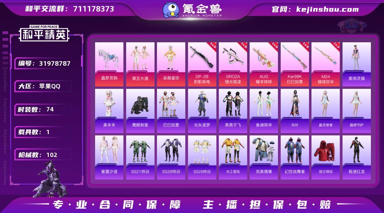 无二次苹果 手Q-2粉装-7特效枪-1载具-3粉色飞行器-31176热力值-7王牌印记-74套装-102枪皮LK26326 【粉色套装】:粉装-第五大道,角色-呆萌星弥 【粉色枪皮等级】:GROZA-镜光银凌(五级),AUG-暖羊咩咩(五级),AKS-74U-森灵之息(五级),Kar98K-巳巳如意(五级),M24-镜域双华(三级),Mk14-福马献瑞(五级),DP-28-豹影疾电(五级) 【粉色载具】:晶梦灵驹 【粉色枪皮】:GROZA-镜光银凌,AUG-暖羊咩咩,AKS-74U-森灵之息,Kar98K-巳巳如意,M24-镜域双华,Mk14-福马献瑞,DP-28-豹影疾电 【粉色飞行器】:炫彩糖果飞行器,镜域双华-灵镜之阶,暮色之舞飞行器 【粉色降落伞】:精灵梦叶罗丽降落伞,晶梦幻蝶降落伞,幻影飞狐降落伞,异瞳寒姬降落伞,炫彩糖果降落伞,流光夜莺降落伞 【稀有套装】:套装-巳巳如意,套装-炫彩糖果,套装-马上有钱,角色-光矢逐梦,套装-燕燕于飞,套装-鱼渊荷华,角色-风玲,套装-晶灵使者,套装-晶辉守护,套装-蜜露汐语,玩偶服-美羊羊,角色-紫俏灵猫 【稀有枪皮】:AUG-冰晶雪宝,AKM-破晓战魂,M16A4-幻世战舞者,M416-蓝色火焰,GROZA-荧海星豚,GROZA-晶梦幻蝶,AUG-甜蜜菠萝,AUG-耀粉歌者,QBZ-洛神天依,M762-天降萌叽,M762-彩虹符号,Mk47-洛神天依,G36C-镜域双华,蜜獾-天降萌叽,UZI-天降萌叽,UMP45-生命誓言,UMP45-绒宝小鹅,Vector-生命誓言,野牛-沙丘之主,P90-巳巳如意,M24-炫彩节奏,Mini14-穿刺龙虾,Mini14-耀粉歌者,Win94-晶梦幻蝶,S686-生命誓言,S686-巳巳如意,S686-千金淑猫,S12K-玩趣呆呆,S12K-破晓战魂,S12K-幻影战神,M249-糯团青竹,DP-28-彩虹符号,MG3-幻世战舞者,大砍刀-万古烈焰,破片手榴弹-巳巳如意 【其他套装】:套装-SS21特训,套装-SS28特训,套装-SS29特训,套装-光之冒险,套装-完美偶像,套装-幻世战舞者,套装-旭日情侣,套装-...