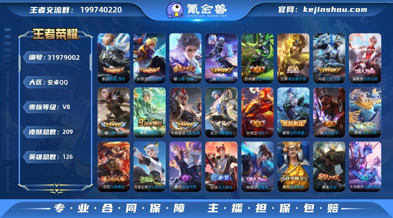 贵族等级:V8 典藏皮肤数:2 珍品无双皮肤数:0 无双皮肤数:0 珍品传说皮肤数:0 传说皮肤数:13 史诗皮肤数:61 皮肤数:209 英雄数:126 段位:星耀 卖家说:急需用钱想要的来