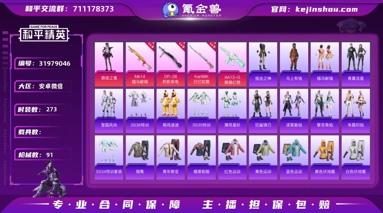 实名: 可修改 时装数: 273 枪械数: 91 热门装扮: 罪夜之冕 稀有枪皮: Kar98K-巳巳如意,DP-28-豹影疾电,MK14-福马献瑞,AA12-G-萌骑幻想
