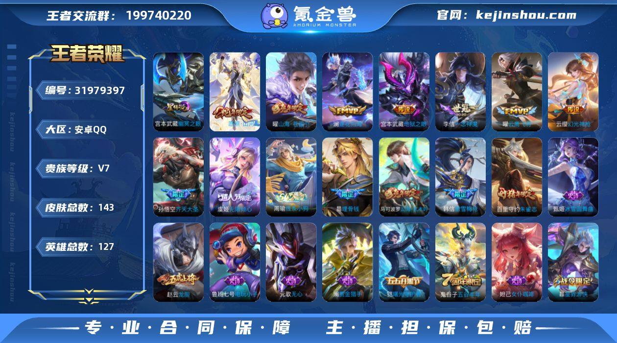 安卓Q-V7-最强王者段位-127英雄-143皮肤-10传说-42史诗【传说皮肤】:马超神骥逐星野,司空震愿照山河定,云缨幻光神枪,澜逐花归海,虞姬无限倾心,孙悟空齐天大圣,曜山海苍雷引,曜云鹰飞将,李信一念神魔,宫本武藏地狱之眼【限定皮肤】:暃埋骨钱,姜子牙天穹之誓,狄仁杰阴阳师,赵云皇家上将,赵云龙胆,孙尚香蔷薇恋人,钟无艳超时空战士,元歌无心,甄姬落雪兰心,马可波罗山海玄木吟,狄仁杰魔术师,狄仁杰万华元夜,达摩沙漠行僧,项羽海滩派对,韩信傲雪梅枪,兰陵王金庭之子,孙悟空齐天大圣,李元芳云中旅人,虞姬无限倾心,鬼谷子五谷丰年,百里守约朱雀志,沈梦溪大漠名商,裴擒虎擒涛扼浪,云中君纤云弄巧,嫦娥暖冬兔眠,曜山海苍雷引,鲁班大师探海日志,桑启海盐诗旅,暃星界游侠,阿古朵江河有灵,张良古海寻踪,鬼谷子天穹祈灯,沈梦溪龙舞盛年,刘邦剑破天穹,刘备异域游侠【年限皮肤】:百里守约朱雀志,曜山海苍雷引,马可波罗山海玄木吟,司空震愿照山河定【赛季限定】:狄仁杰万华元夜,达摩沙漠行僧,兰陵王金庭之子,沈梦溪大漠名商,李元芳云中旅人,桑启海盐诗旅,裴擒虎擒涛扼浪,鲁班大师探海日志,张良古海寻踪,鬼谷子天穹祈灯,刘邦剑破天穹,姜子牙天穹之誓,太乙真人谧流熔炉,钟馗虚灵犬护【战令限定】:钟无艳超时空战士,甄姬落雪兰心,暃星界游侠,嫦娥暖冬兔眠,周瑜线条小狗【史诗皮肤】:钟馗锁墨魂,周瑜线条小狗,暃埋骨钱,阿古朵江河有灵,镜真我赫兹,马可波罗山海玄木吟,暃星界游侠,元歌无心,鬼谷子五谷丰年,钟无艳超时空战士,澜赏金猎手,韩信傲雪梅枪,云中君纤云弄巧,赵云龙胆,狄仁杰鹰眼统帅,百里守约朱雀志,孙策猫狗日记,白起星夜王子,程咬金功夫厨神,李元芳逐浪之夏,刘禅天才门将,铠曙光守护者,百里守约特工魅影,亚瑟心灵战警,兰陵王...