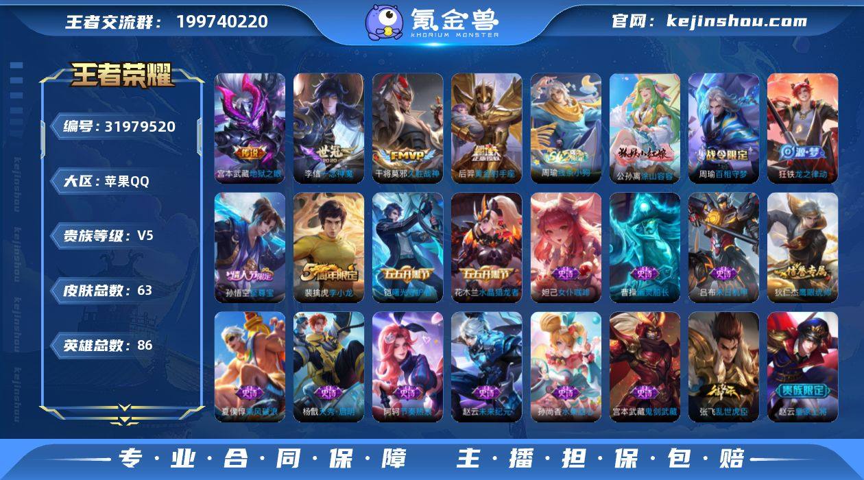 苹果Q-V5-永恒钻石I段位-86英雄-63皮肤-4传说-21史诗【传说皮肤】:李信一念神魔,干将莫邪久胜战神,后羿黄金射手座,宫本武藏地狱之眼【限定皮肤】:赵云皇家上将,项羽海滩派对,孙悟空至尊宝,裴擒虎李小龙【赛季限定】:甄姬逆浪荇歌,亚瑟荣光之誓【战令限定】:周瑜百相守梦,孙策百相守梦,周瑜线条小狗【史诗皮肤】:周瑜线条小狗,公孙离涂山容容,周瑜百相守梦,狂铁龙之律动,杨戬天秀启明,裴擒虎李小龙,狄仁杰鹰眼统帅,阿轲节奏热浪,铠曙光守护者,夏侯惇乘风破浪,花木兰水晶猎龙者,孙悟空至尊宝,张飞乱世虎臣,吕布末日机甲,曹操幽灵船长,刘禅绅士熊喵,妲己女仆咖啡,嬴政摇滚巨星,孙尚香水果甜心,宫本武藏鬼剑武藏,赵云未来纪元,赵云皇家上将【其他皮肤】:兰陵王雾影缉谜,艾琳鹤鸣心笺,亚瑟荣光之誓,莱西奥踏浪烽翎,孙策百相守梦,云中君云械蓝图,甄姬逆浪荇歌,露娜命运加冕,典韦铁骨偃魂,后羿完美运算,刘禅唤灵魔甲,盘古重装意志,钟无艳海滩丽影,宫本武藏万象初新,刘备万事如意,甄姬花好人间,达摩拳王,亚瑟死亡骑士,典韦黄金武士,妲己少女阿狸,安琪拉玩偶对对碰,白起白色死神,赵云忍炎影,赵云白执事,韩信教廷特使,项羽海滩派对,李信灼热之刃,百里守约绝影神枪,干将莫邪第七人偶,黄忠芝加哥教父,诸葛亮星航指挥官,杨戬埃及法老,马可波罗激情绿茵,虞姬加勒比小姐,兰陵王隐刃,孙悟空西部大镖客,貂蝉异域舞娘【营地ID】:1824295367